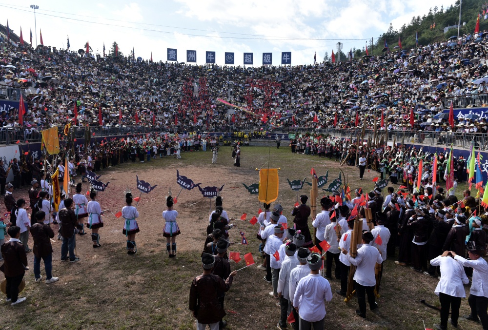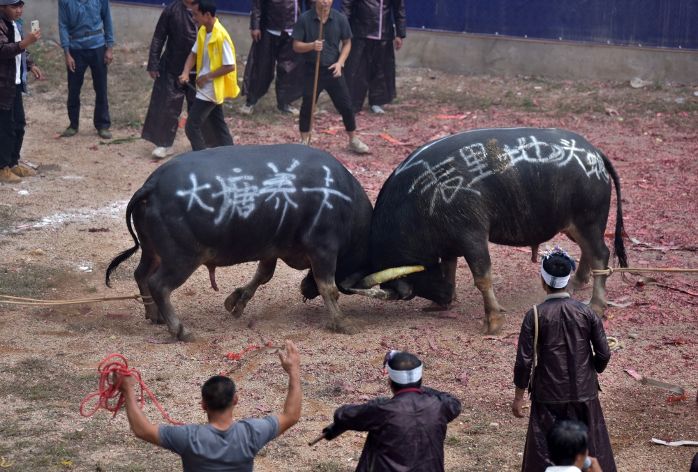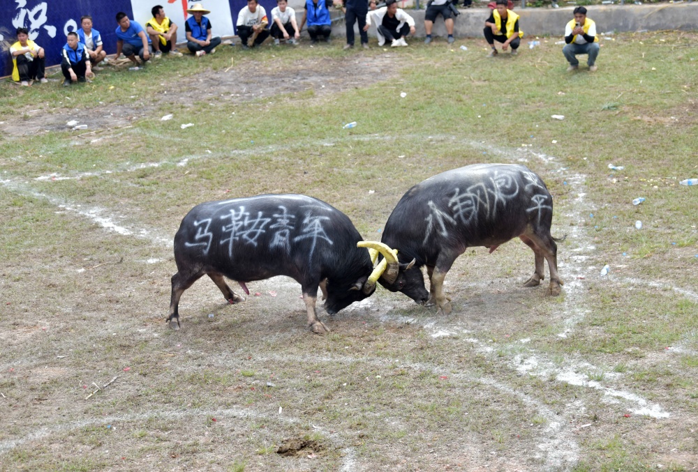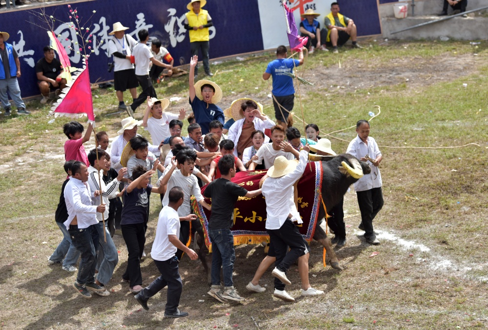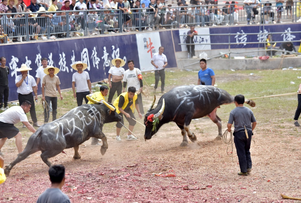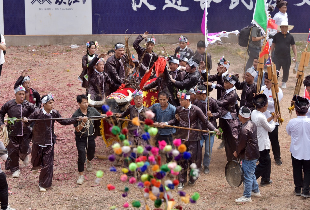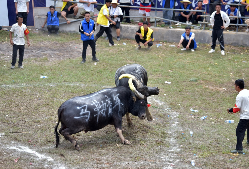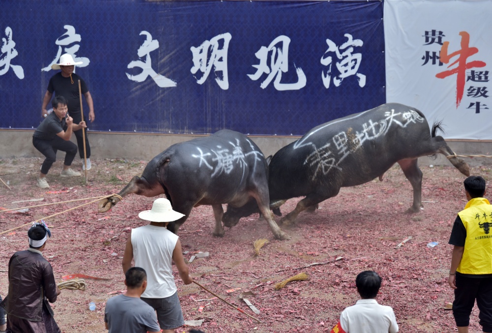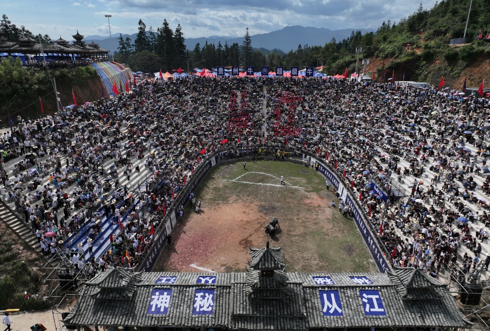 10月2日,贵州省黔东南苗族侗族自治州从江县丙妹镇大塘村松学斗牛塘举行民俗文化展演和传统民间斗牛等民俗活动,欢庆国庆,迎接中秋。