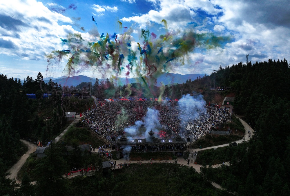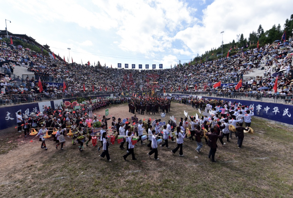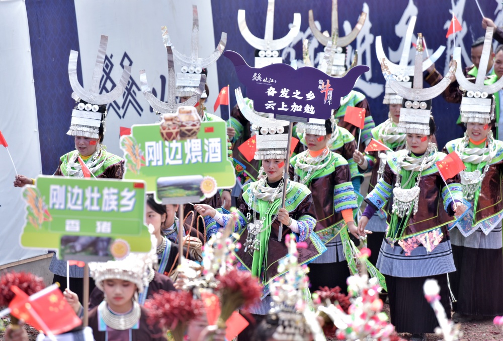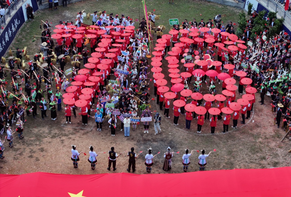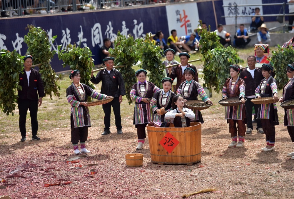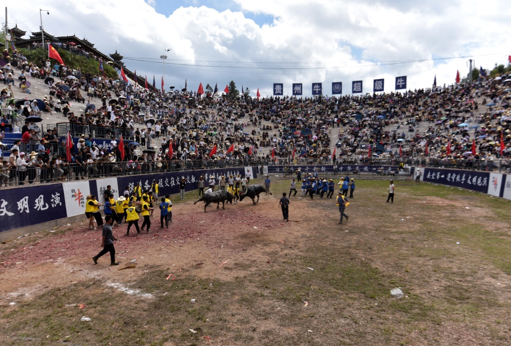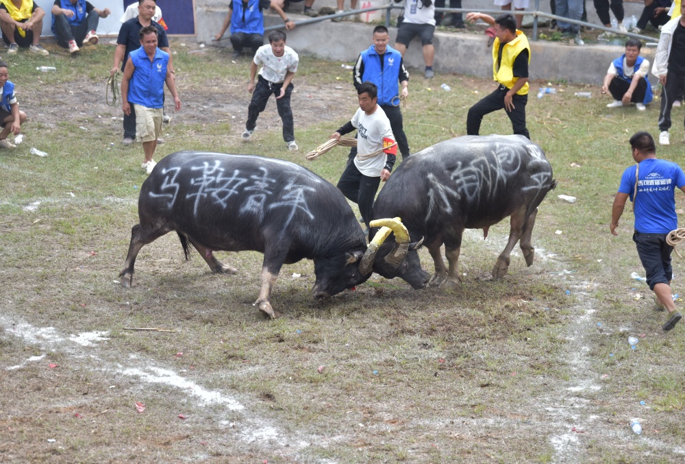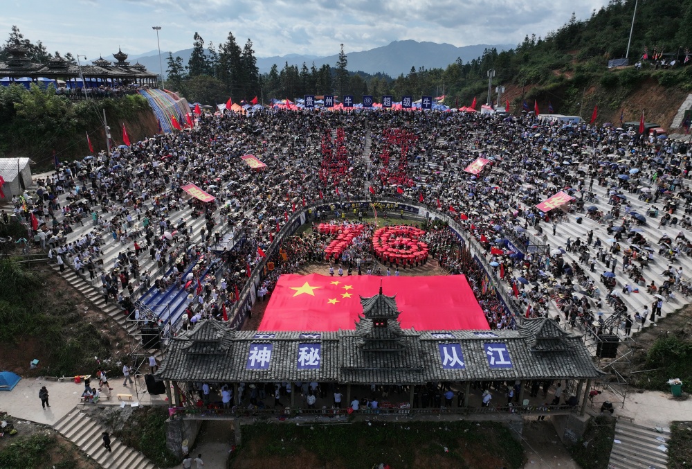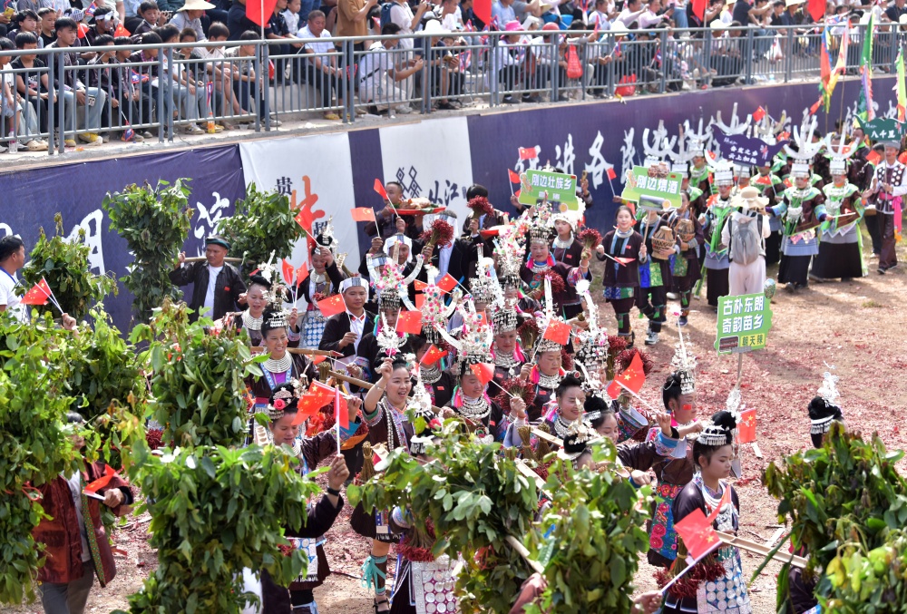 10月2日,贵州省黔东南苗族侗族自治州从江县丙妹镇大塘村松学斗牛塘举行民俗文化展演和传统民间斗牛等民俗活动,欢庆国庆,迎接中秋。