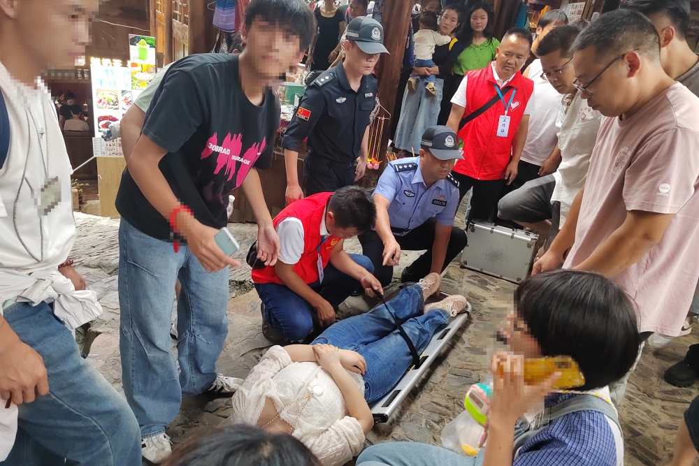 10月3日15时许,郎德景区表演场周边传来急促的呼救声。正在此处巡逻的郎德派出所民警立即循声赶赴现场,发现一名广东籍女游客因突发疾病摔倒在地,面色苍白、意识不清,同行人员已急得手足无措。