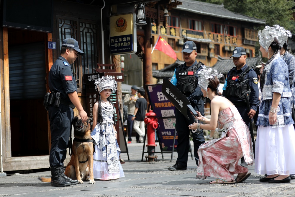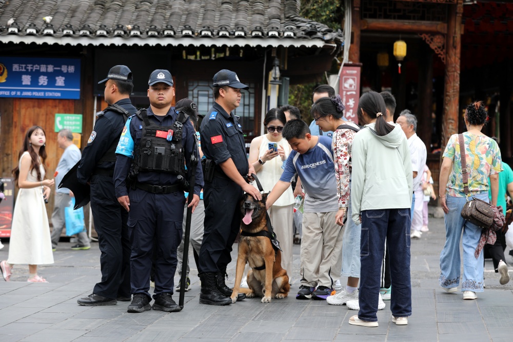 双节期间,雷山县公安局警犬中队的“特殊警员”们也全员上岗,与民辅警一同在西江、大塘、郎德苗寨等重点景点开展驻点执勤与徒步巡逻。这些身着专用装备的警犬身姿矫健,既具备专业防控能力,又因温顺模样收获游客喜爱,不少游客驻足拍照留念。
