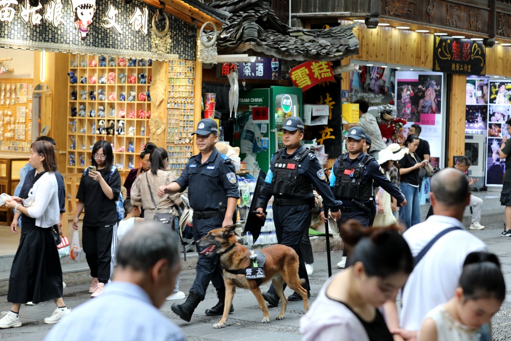 “看到警察和警犬一起巡逻,感觉特别安心!”来自河南的游客李先生说道。这支“犬防+人防”的巡逻队伍,不仅以显性用警提升了见警率与管事率,更成为景区里一道流动的“平安风景线”,让安全感看得见、摸得着。