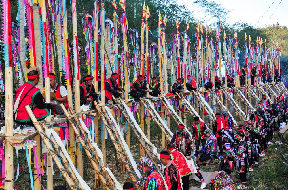 据了解,在贵州省境内的瑶族村寨,“度戒”是当地瑶族一项传统成人教仪,该仪式又称“戒道”,内容包括搭戒台、诵经歌舞、上刀梯等环节,受戒者需遵守“十戒”规范,获得法名后方可婚配并参与宗教活动。仪式由多位师傅共同主持,旨在通过“授箓”实现宗教传承与社会角色确认。