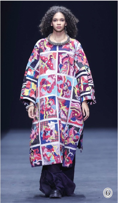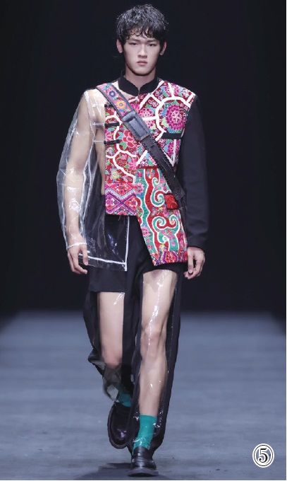 聚光灯缓缓照出一片耀眼的圆形区域,穿着苗族服饰的妈妈坐在秀场中央,向依偎在身旁的孩子讲述破茧成蝶的故事。古老的苗族歌谣中,一个巨大的蚕茧被撕开,模特们身穿带有苗绣元素的时装鱼贯而出,带来一场名为《破茧》的视觉盛宴。