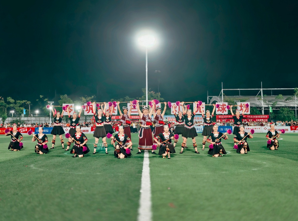 三穗县舞蹈《一路花开》传递春日生机,全场大合唱《歌唱祖国》引发情感共鸣。榕江县村超非遗艺术表演团带来的侗族大歌《天地人间充满爱》 尤为震撼,这支无指挥、无伴奏的多声部合唱,以自然和声诠释人类非物质文化遗产的魅力。岑巩四中学子的大型足球操则将体育精神与青春活力完美融合,表演尾声的璀璨烟花让球场成为欢乐海洋。