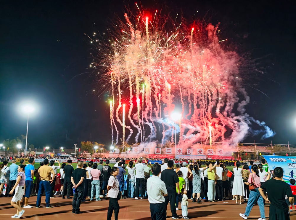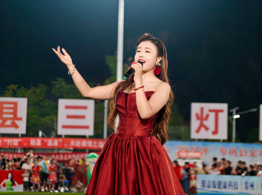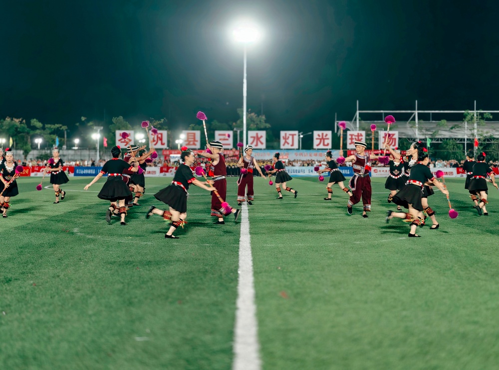 垫场赛落幕,岑巩县融媒体中心主持人张美超、李慧娟携手登场,挂宣传标语的无人机同步升空,将夜空装点成流动的宣传画廊。文艺表演以省级非遗思州战鼓开篇,铿锵鼓点搭配金钱棍与花灯扇子舞,瞬间展现 “千年思州府” 的文化底蕴。