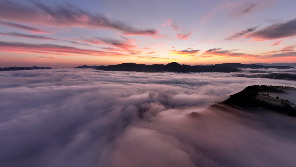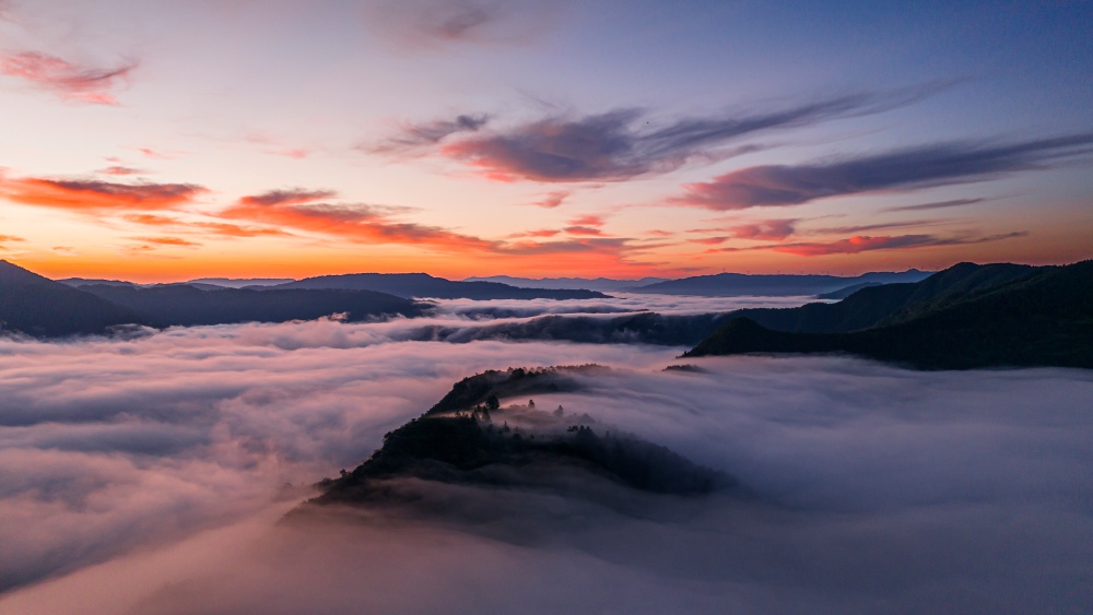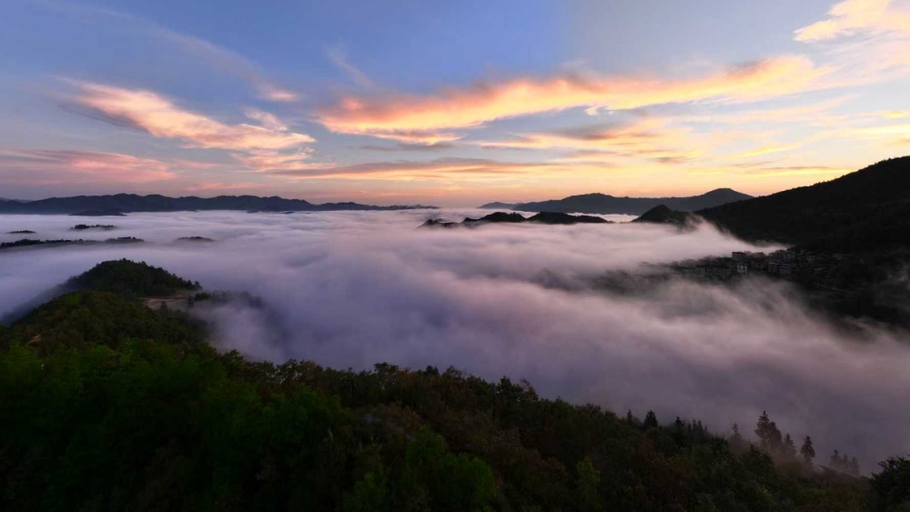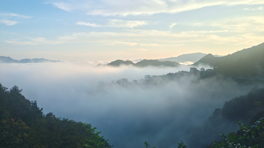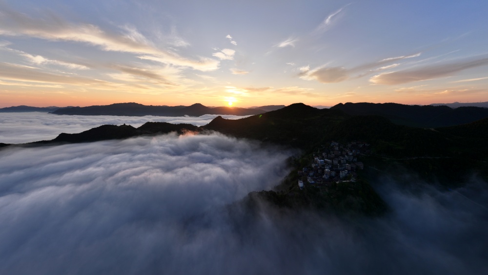 高山之巅望云海,波澜壮阔际无边。拂晓,朝阳透过薄雾,洒落云间,洁白无暇。绵绵云海间,山巅、房屋若隐若现,好似人间仙境。