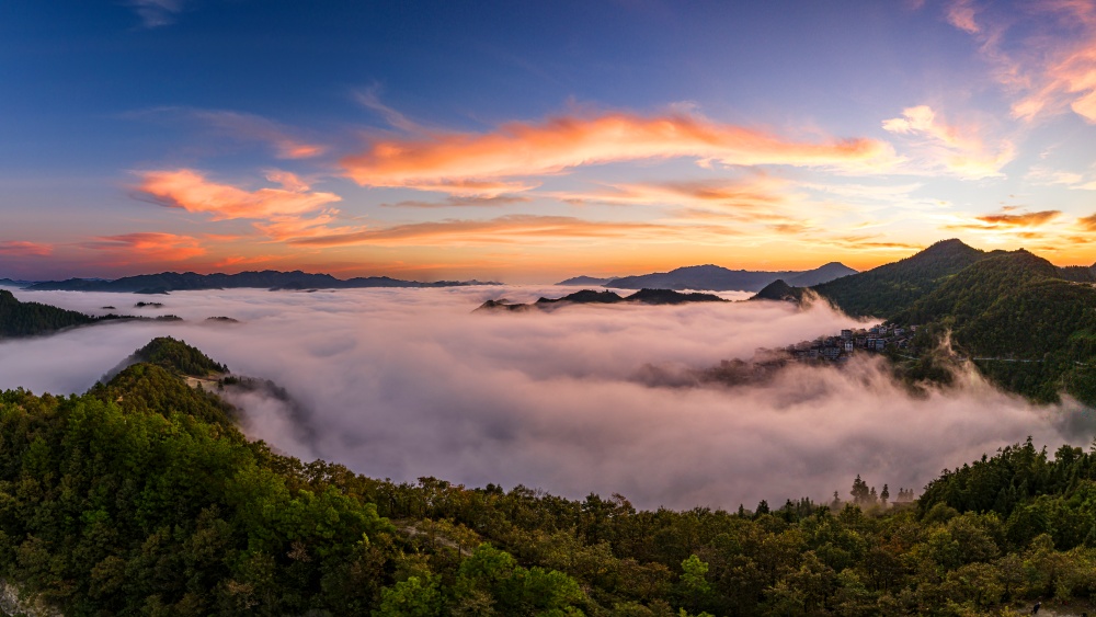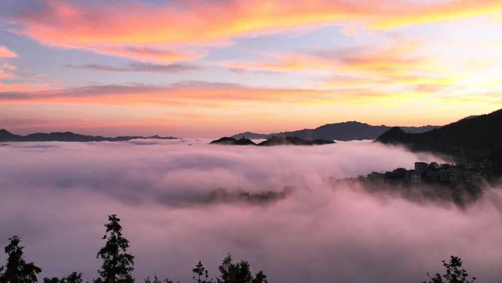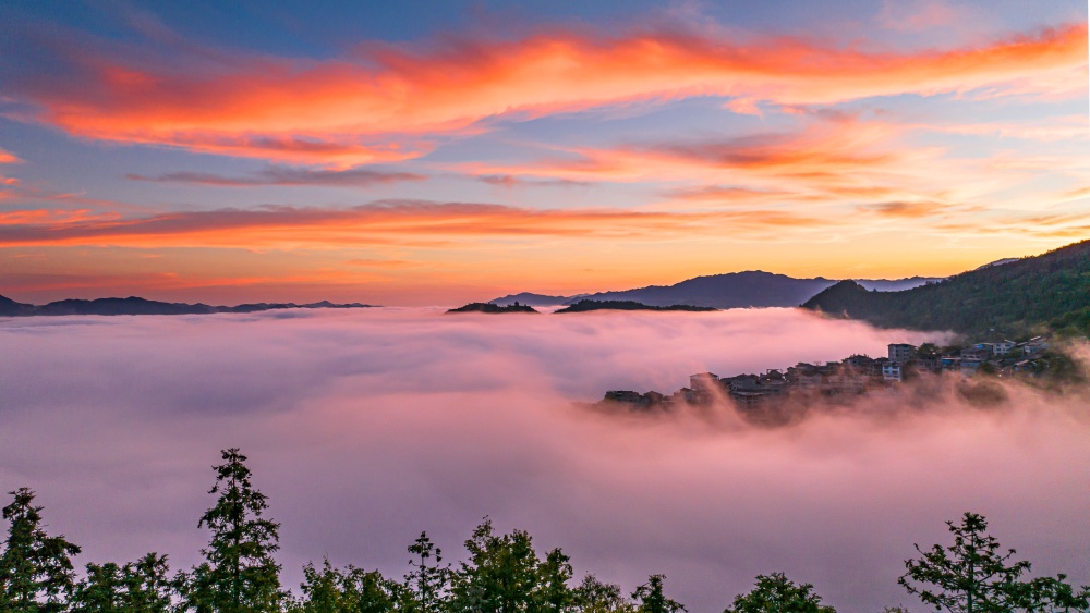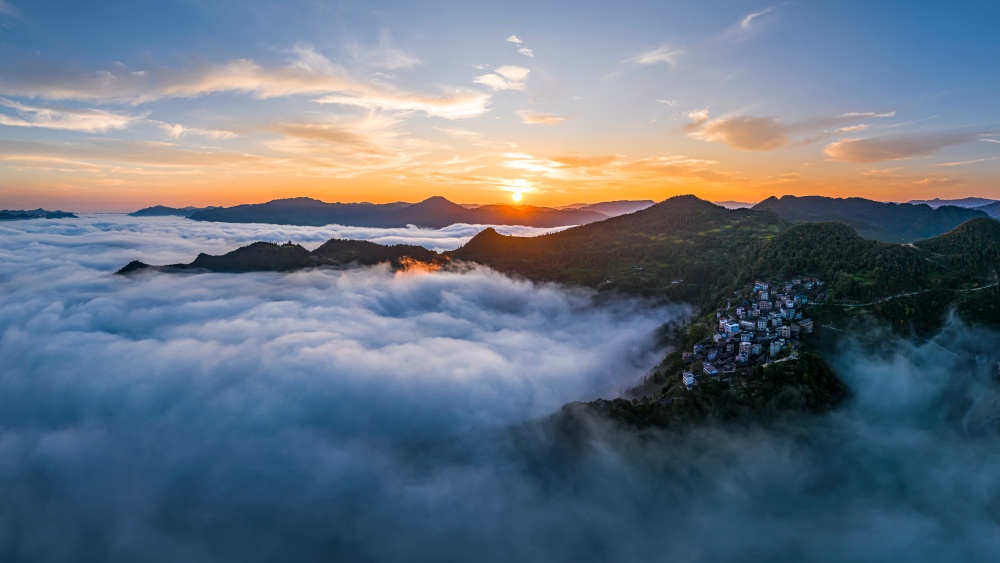 微风袭袭,层层叠叠的云浪翻滚,犹如千军万马在奔腾,增添了独特的灵动与壮阔。随着东方天际渐露微光,一轮红日冲破云层,金色的霞光瞬间洒满整片云海,翻滚的云浪仿佛被泼上了熔金,从浅橙到亮金的色彩层层递进,耀眼却不刺眼。云雾之下,房屋、远山与云海、日出勾勒出一副美丽画卷,美不胜收。