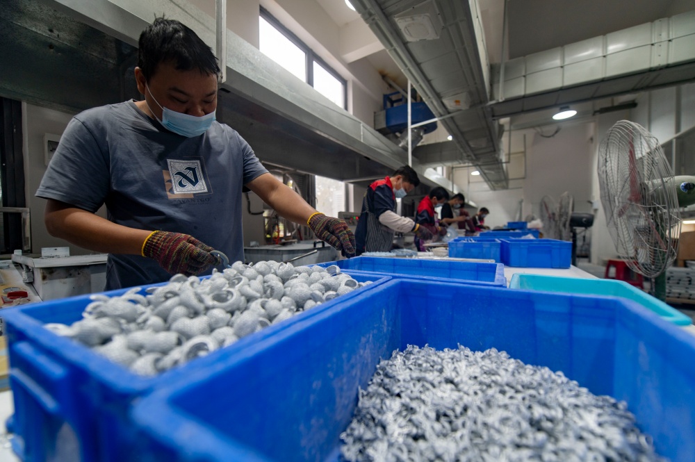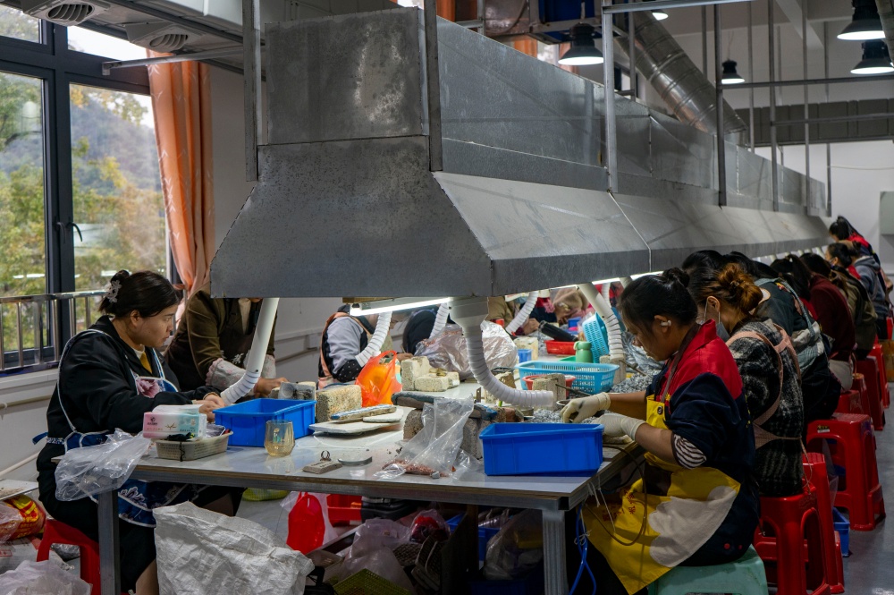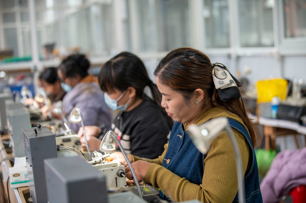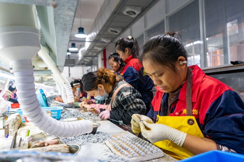 10月22日,在贵州省从江县洛香镇井当社区一家饰品生产企业生产车间,工人在加紧赶制海外订单。