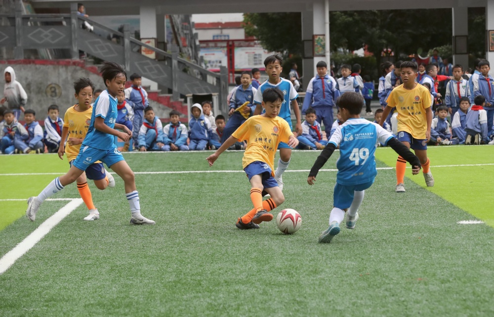 10月22日,在贵州省黔东南苗族侗族自治州榕江县古州镇第三小学足球场,古州镇第三小学六(5)班足球队员(蓝衣)与六(2)班足球队员在比赛中拼抢。