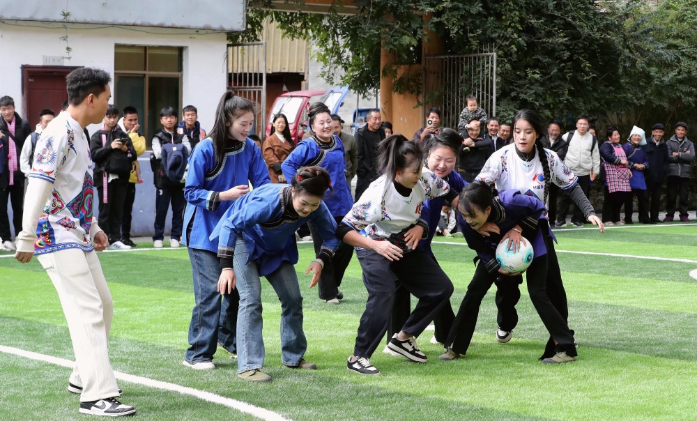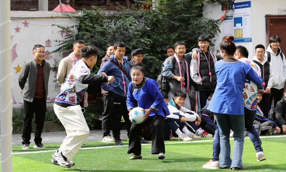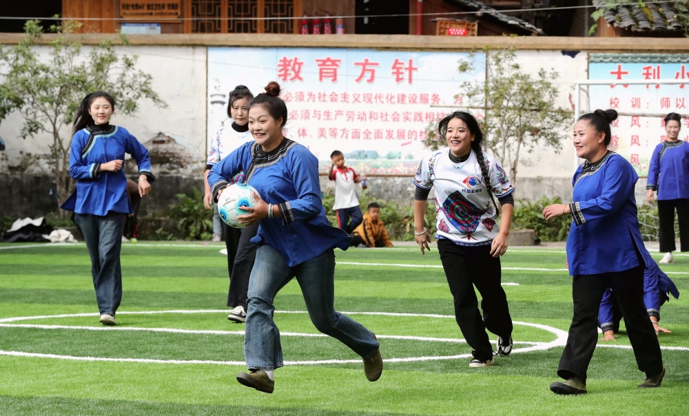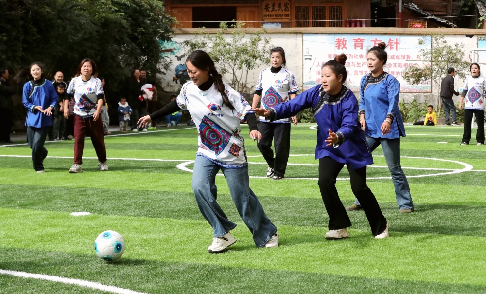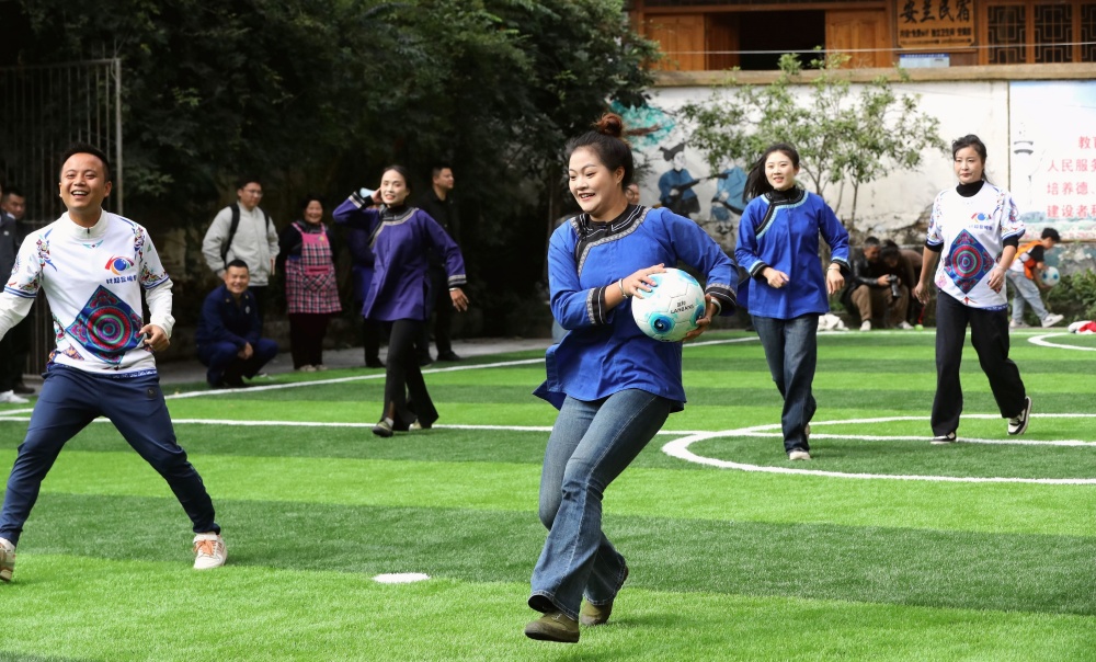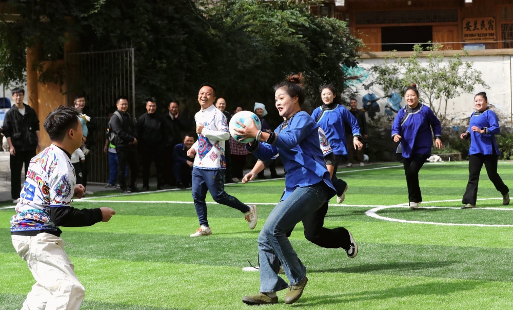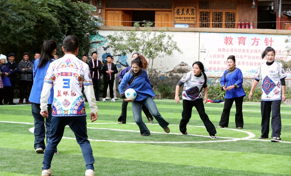 当日,在贵州省黔东南苗族侗族自治州榕江县栽麻镇传统村落大利侗寨兴建的5人制足球场举行启用开球仪式,东道主大利侗寨蓝衣扫把足球队与显眼包足球队开展首场趣味足球比赛。趣味足球赛让观众和游客大饱眼福。