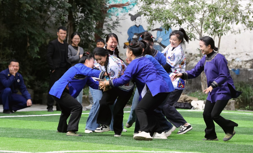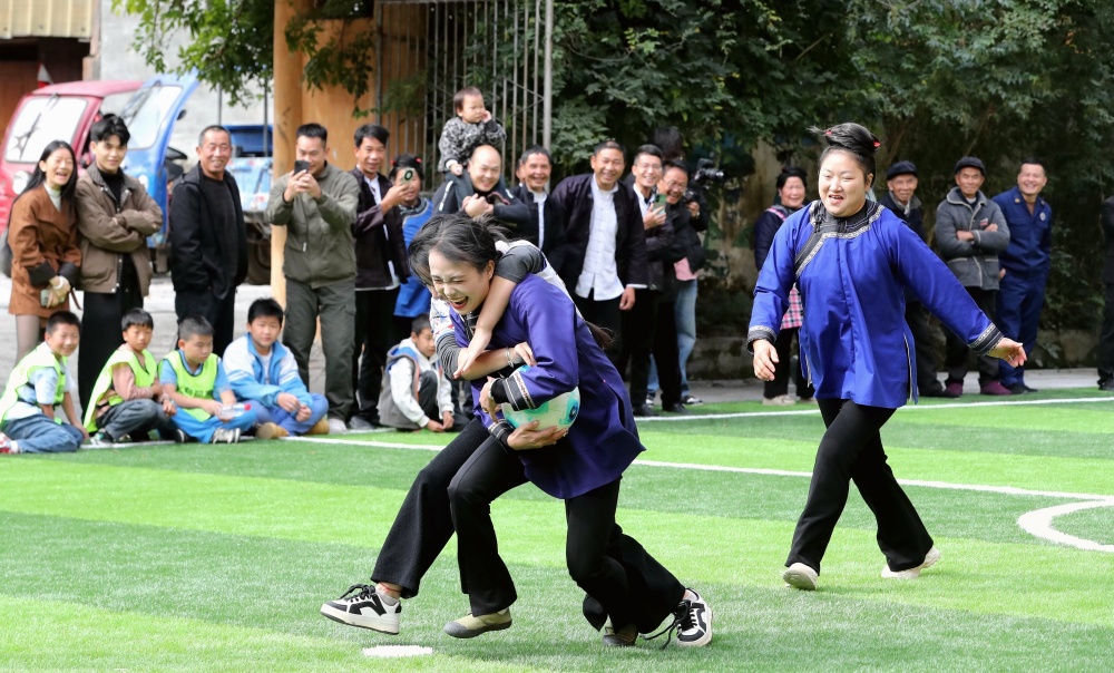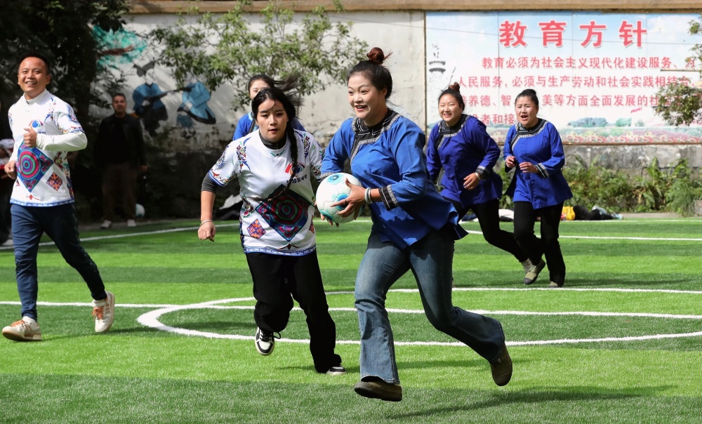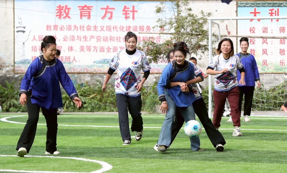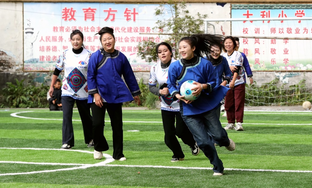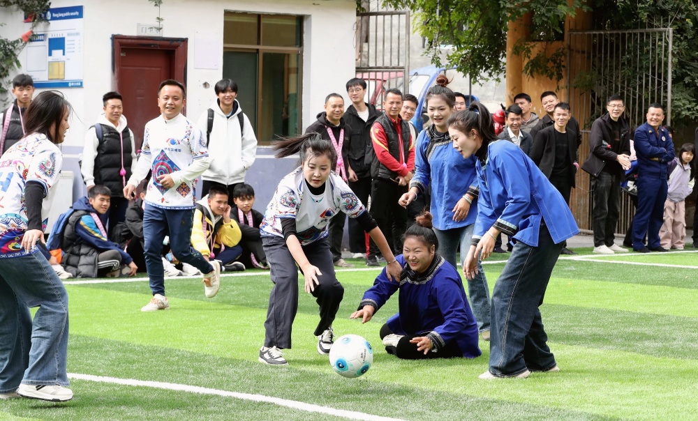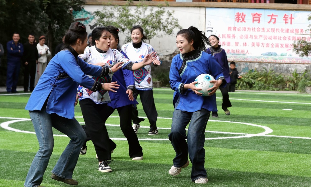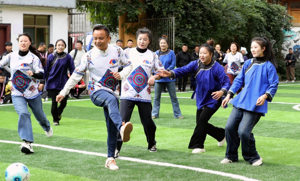 当日,在贵州省黔东南苗族侗族自治州榕江县栽麻镇传统村落大利侗寨兴建的5人制足球场举行启用开球仪式,东道主大利侗寨蓝衣扫把足球队与显眼包足球队开展首场趣味足球比赛。趣味足球赛让观众和游客大饱眼福。