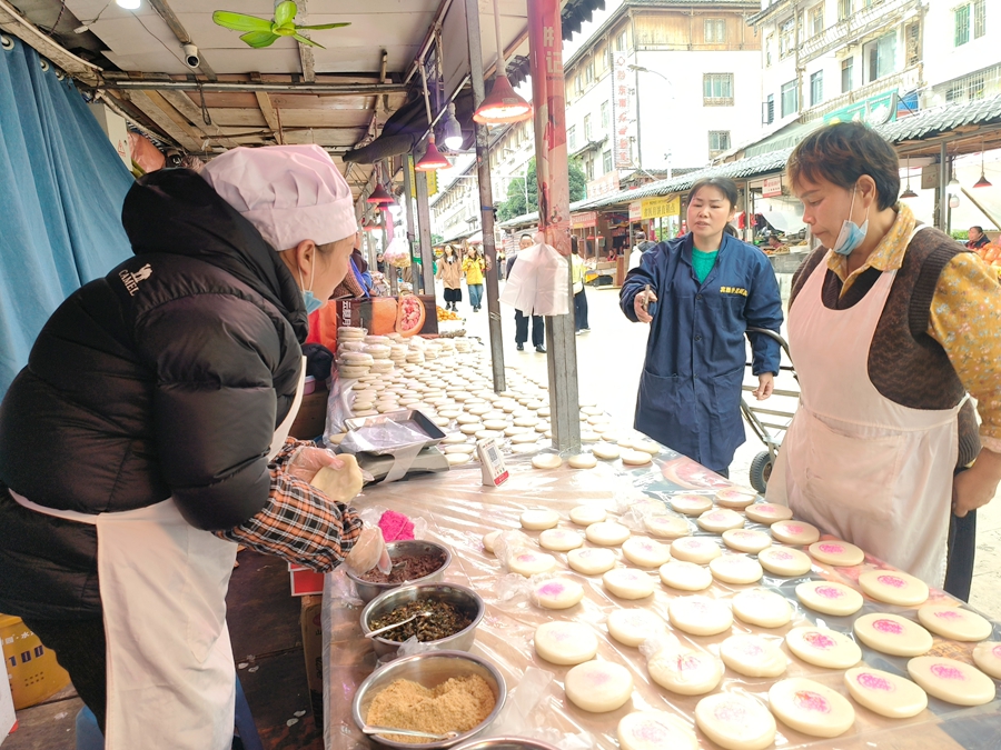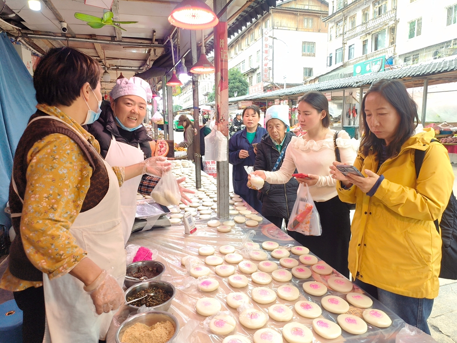 人们走走停停,不慌不忙的逛着,有挑选着心仪物品,有的坐下来吃上一碗酸汤粉或米豆腐,有的遇到老熟人聊聊天,有的坐着看人来人往,岁月静好在此刻具象化。