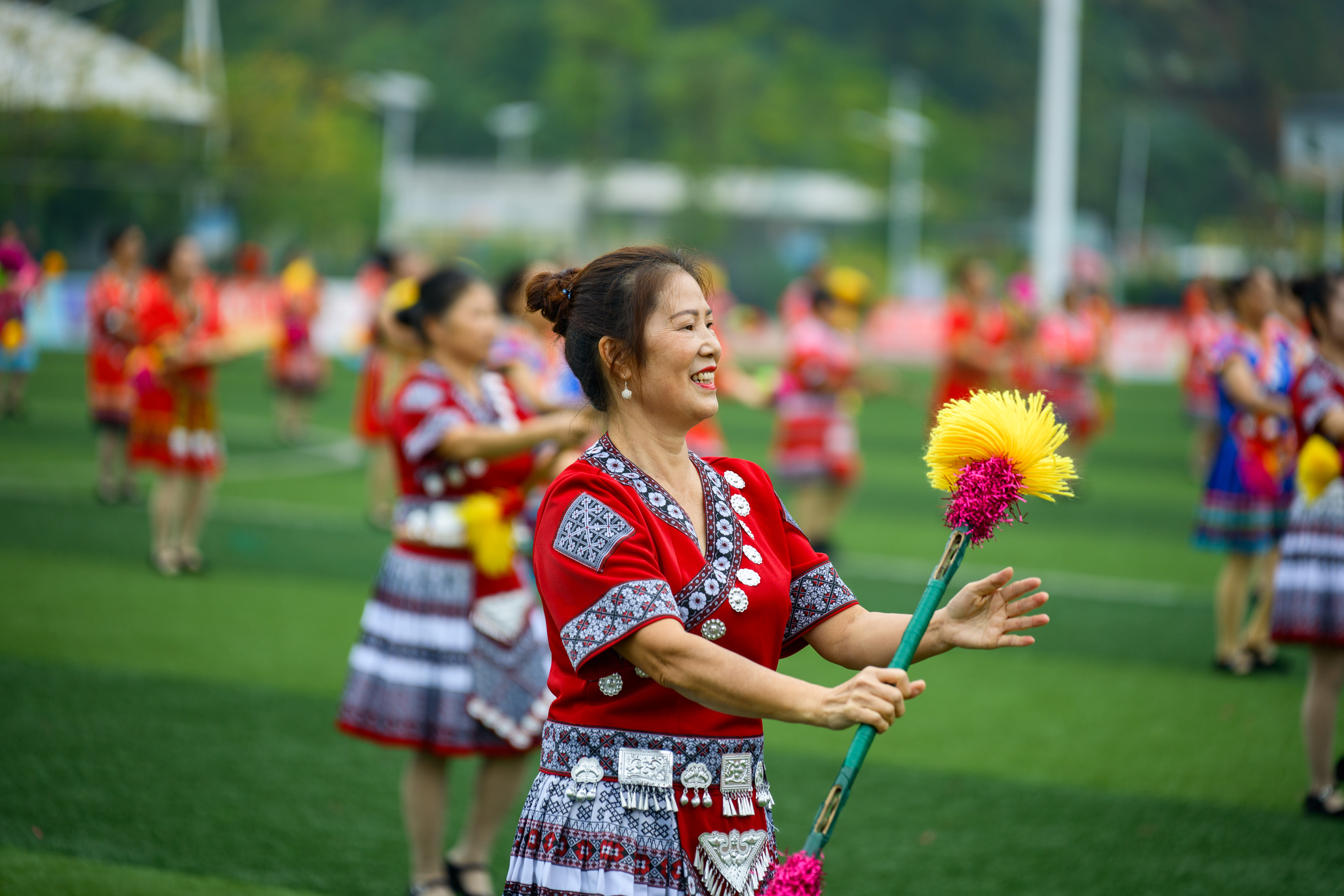 开幕式上,贵州省级非遗思州金钱棍率先登场,成为开场表演的亮点。表演者手持串满铜钱的木棍,随着欢快节奏辗转腾挪,铜钱碰撞发出清脆声响,灵动的舞姿既展现了非遗文化的古朴韵味,又透着与足球运动相通的活力与张力。