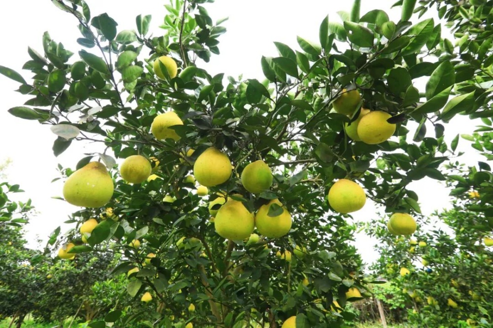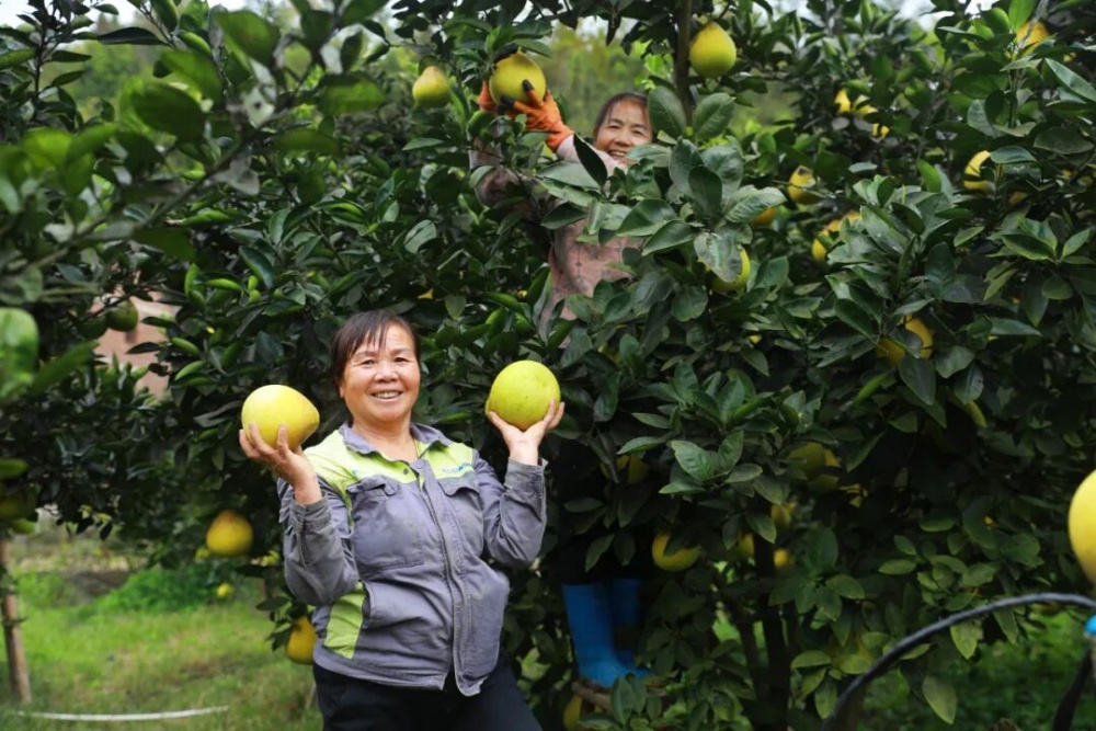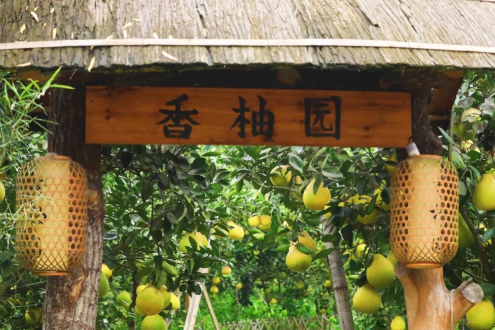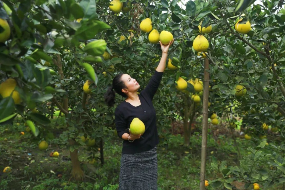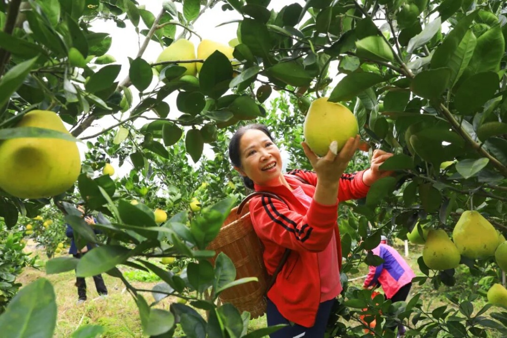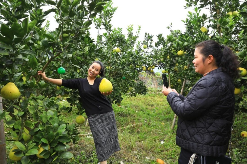 香柚园里,不时传来游客们的欢声笑语,几位游客正兴致勃勃拍照打卡,挑选心仪的果子,体验采摘的乐趣。