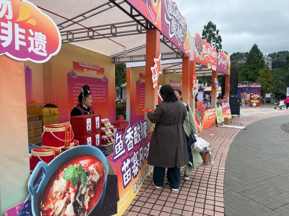 雷山本地商户王微满脸喜悦地介绍:“昨天我们的鱼酱酸就卖出了2500多元,带来的五六箱货都快见底了。真没想到这么受欢迎,这是对我们本土非遗产品最好的认可。”她表示,这样的展销不仅带动了销售,更让传统手艺被更多人看见和喜爱。