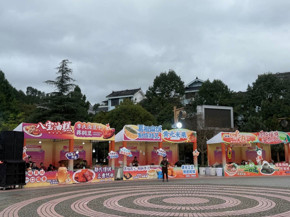 展示区,来自陶瓷技艺、临淮泥塑、非遗点翠等各类非遗项目的代表性产品齐聚一堂,雷山鱼酱酸、重庆怪味胡豆、成都葛祖麻饼等近二十种地方非遗美食也吸引众多游客驻足品尝和购买。