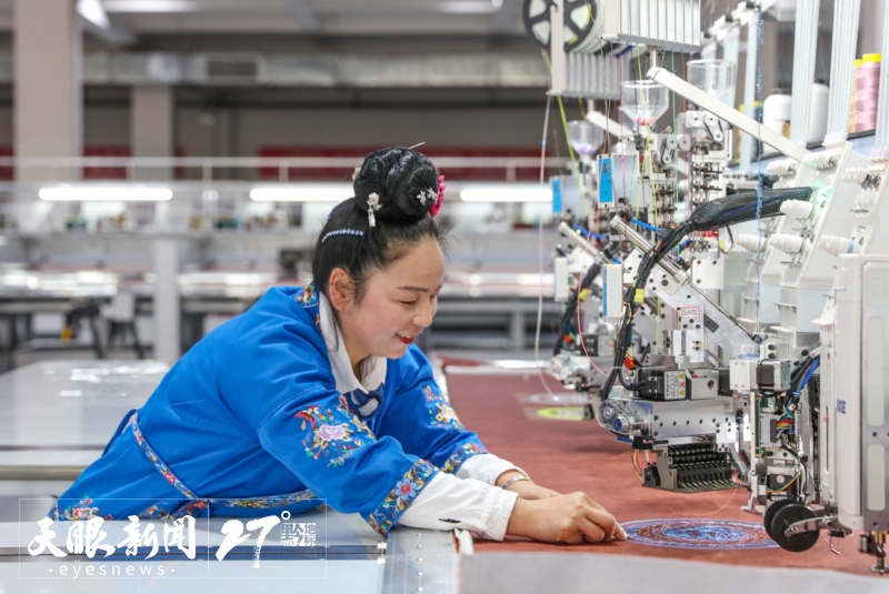 走进位于黔东南州施秉县的舞水云台公司生产车间,智能化苗绣生产线通过数字化编程技术将传统苗绣针法转化为机器语言,一件件精美的苗绣产品从生产线制作完成。