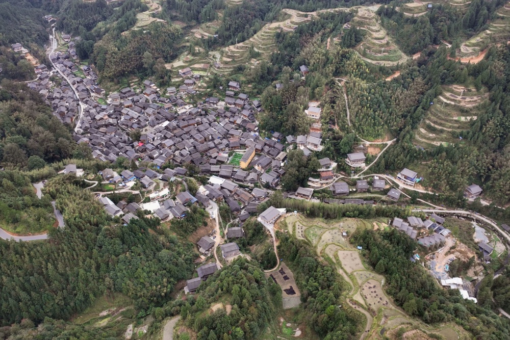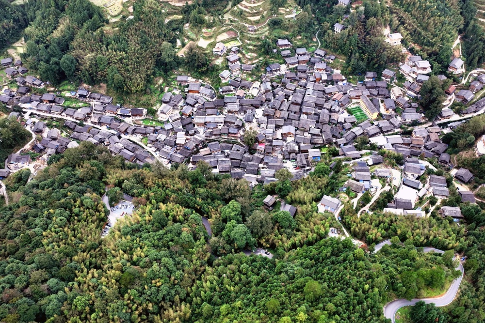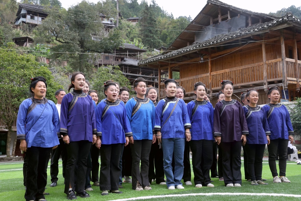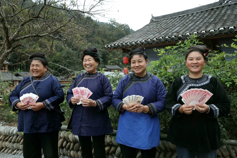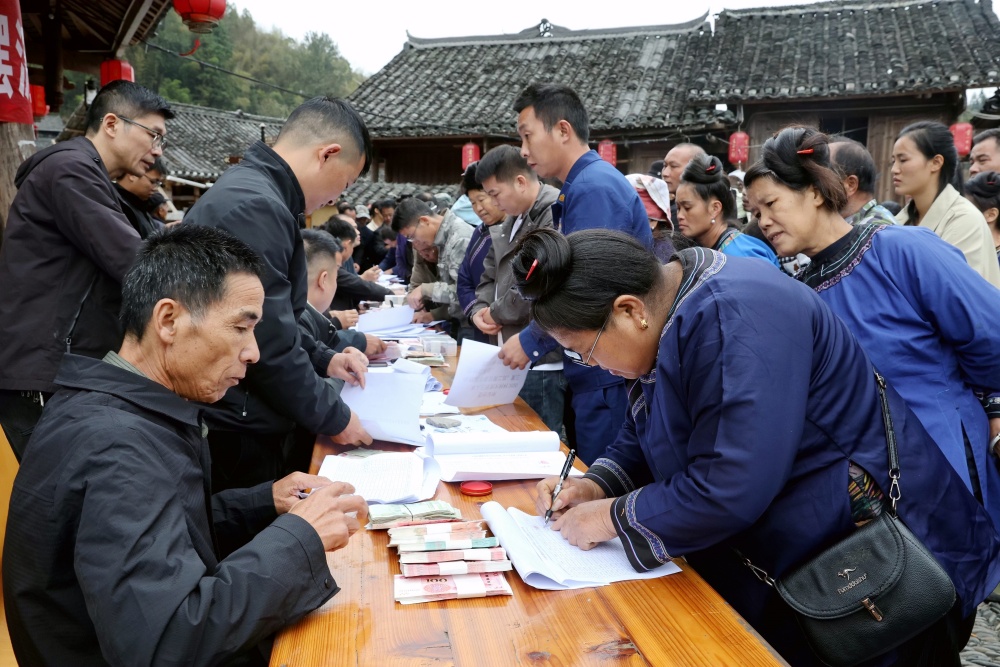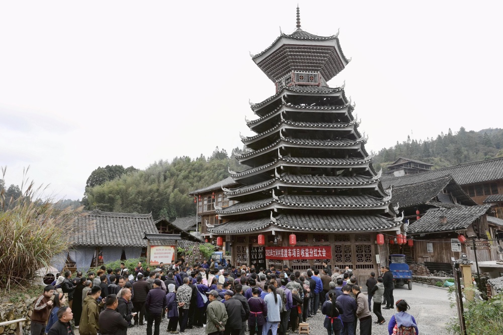 10月31日,在贵州省黔东南苗族侗族自治州榕江县栽麻镇大利村的鼓楼前,全村309户村民聚集在里喜领摆渡车项目分红。