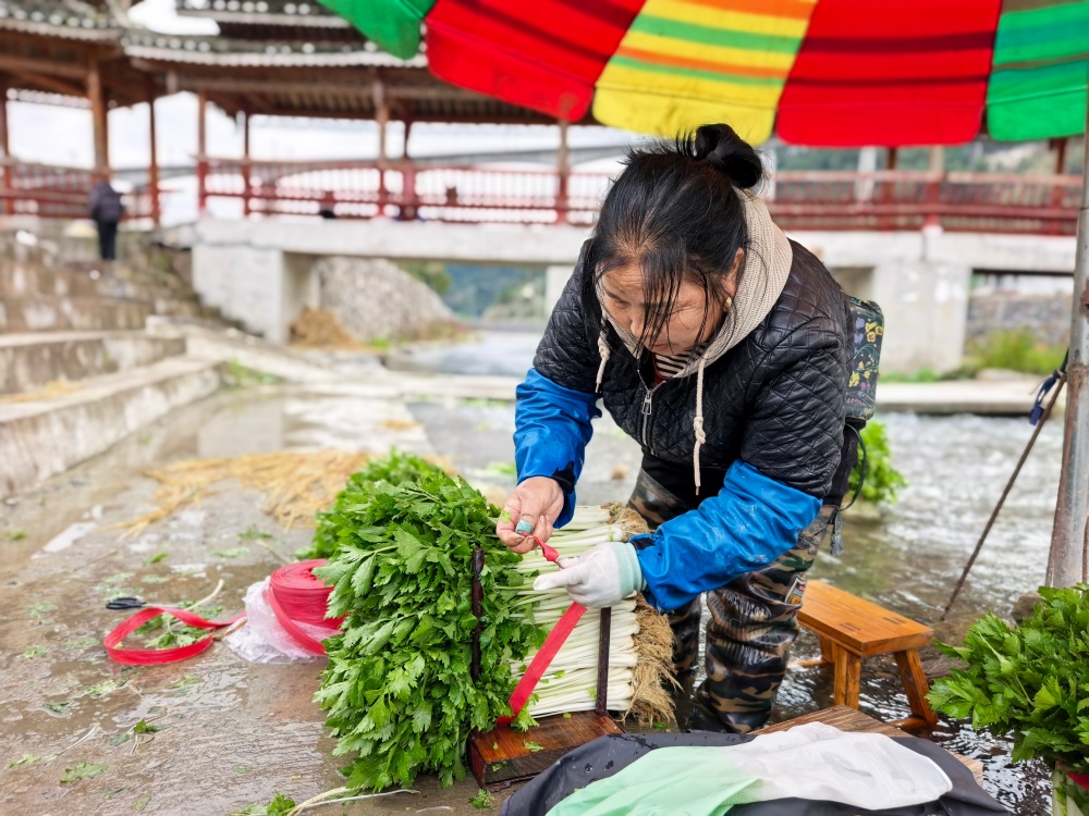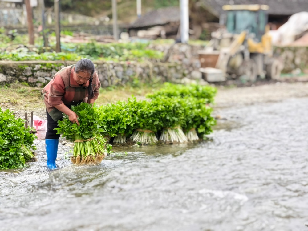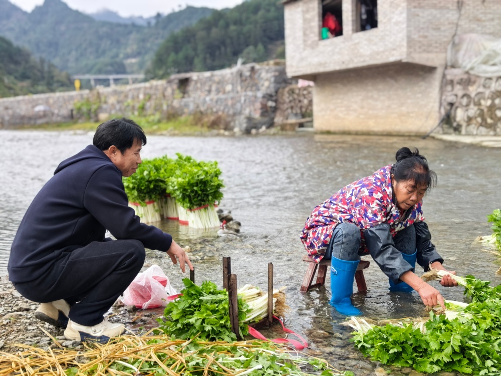 走进下司镇淑里村,田间地头满是村民们忙碌的身影。他们分工明确、动作娴熟:有的熟练地在地里施肥,为蔬菜生长注入养分;有的来回穿梭运送肥料,脚步匆匆却井然有序;还有的忙着采收成熟的蔬菜,利落干脆。溪边,村民们正仔细清洗芹菜,随后精心整理打包,准备送往批发商手中。