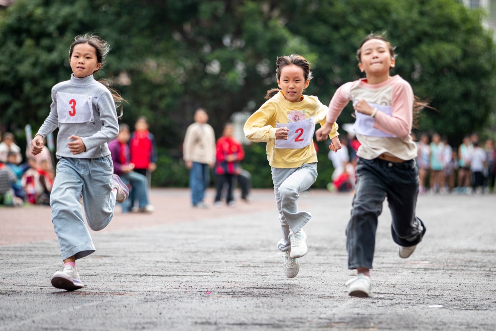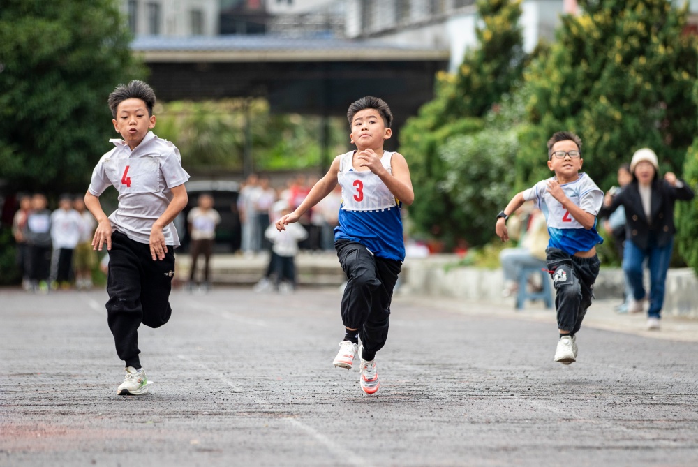 11月12日,从江县刚边壮族乡中心小学学生在校园运动会上参加中长跑比赛。