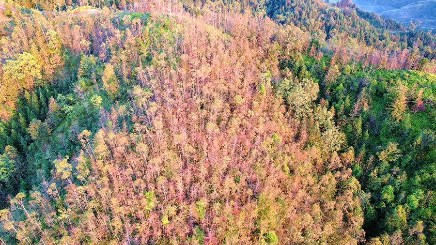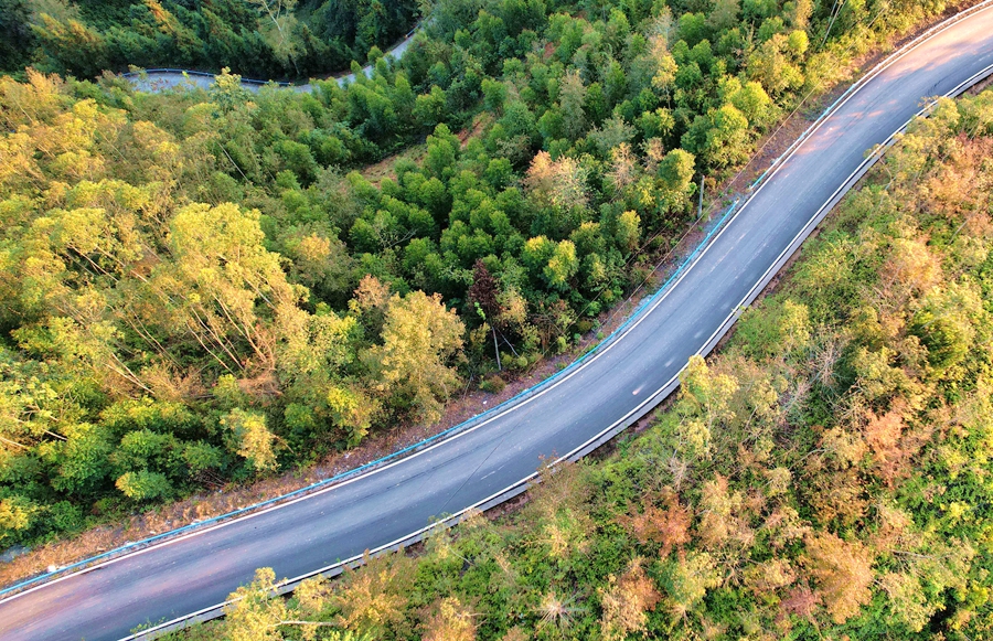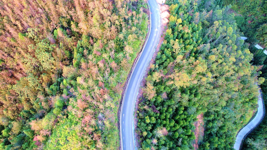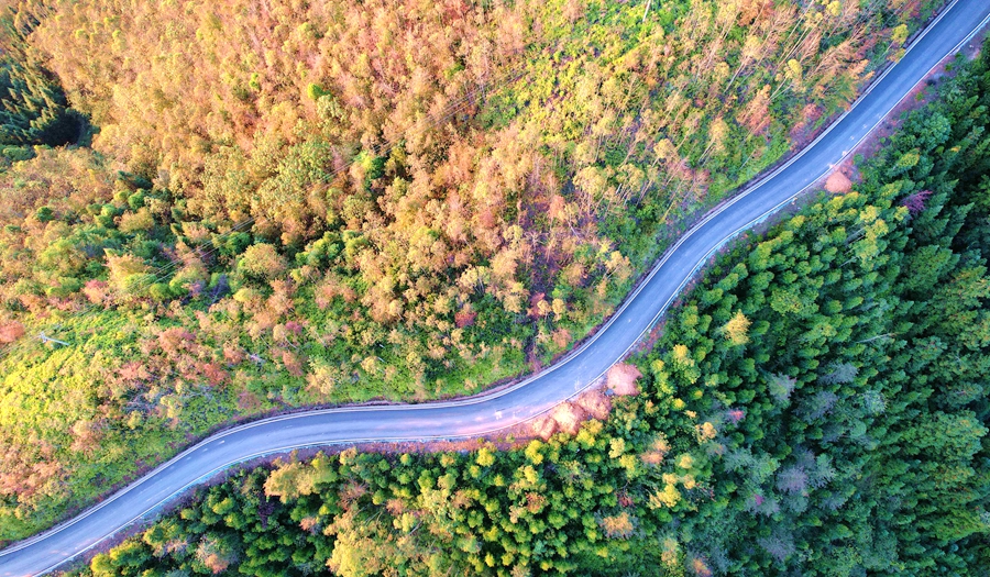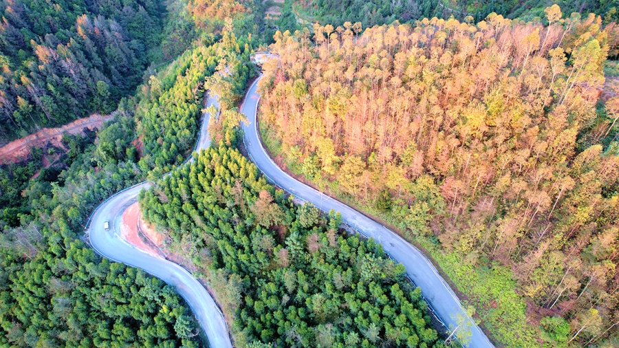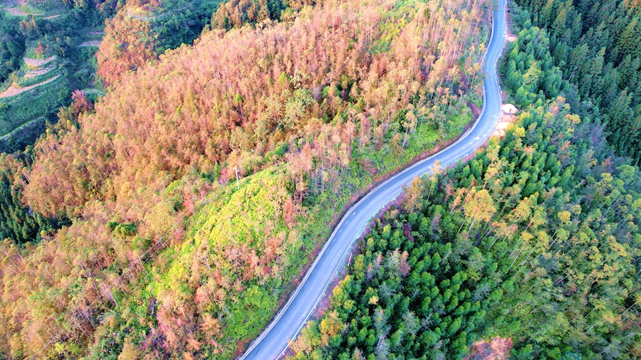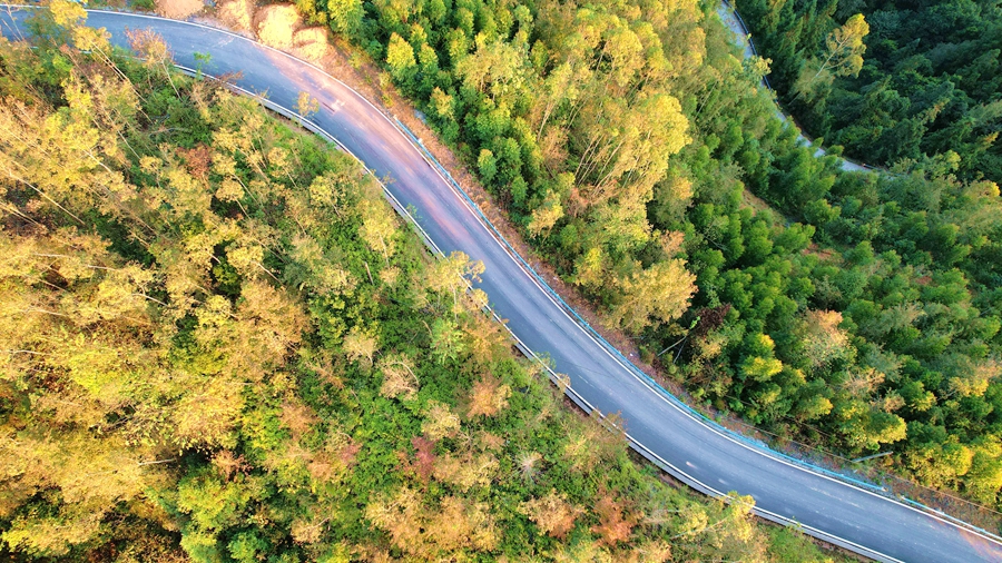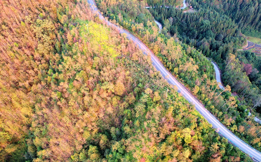 2025年11月15日,贵州省黔东南苗族侗族自治州从江县四寨河口至高增乡占里村旅游公路沿线,山林色彩斑斓,红叶似火,层林尽染,风景如画。