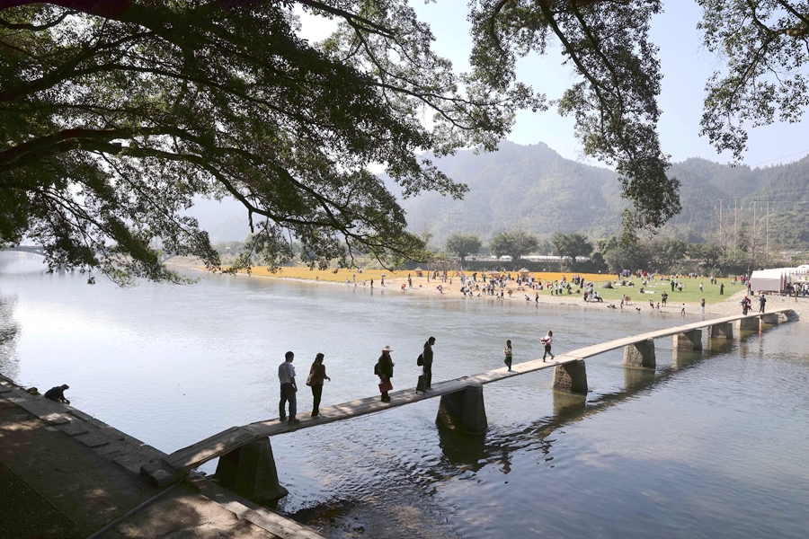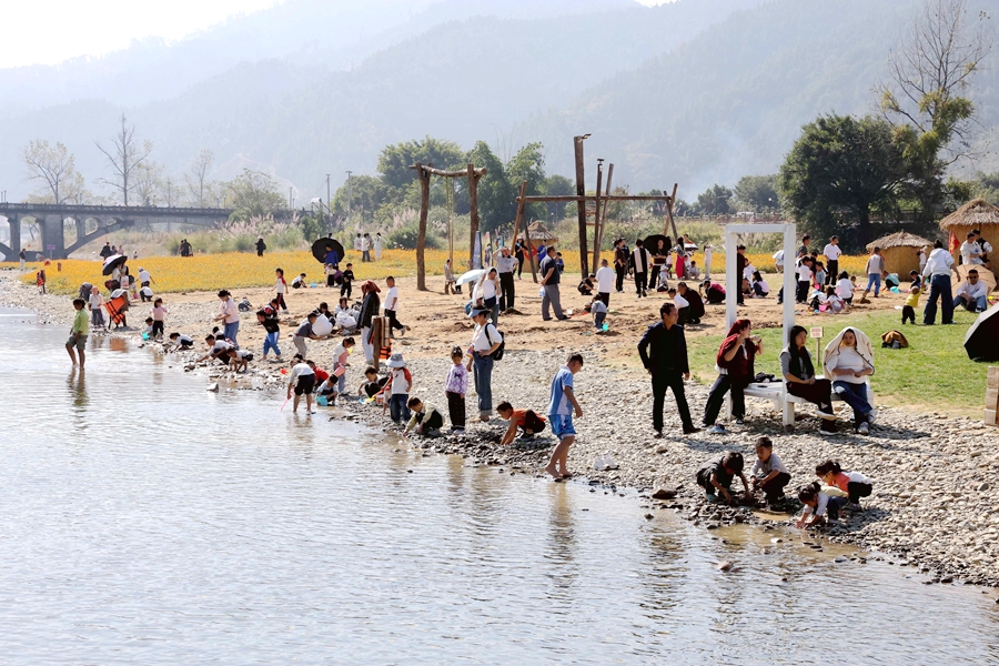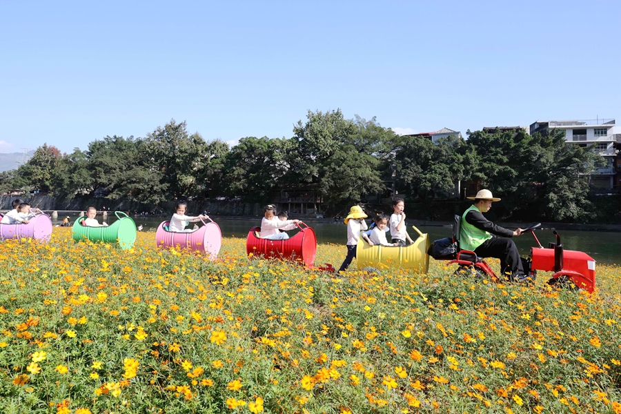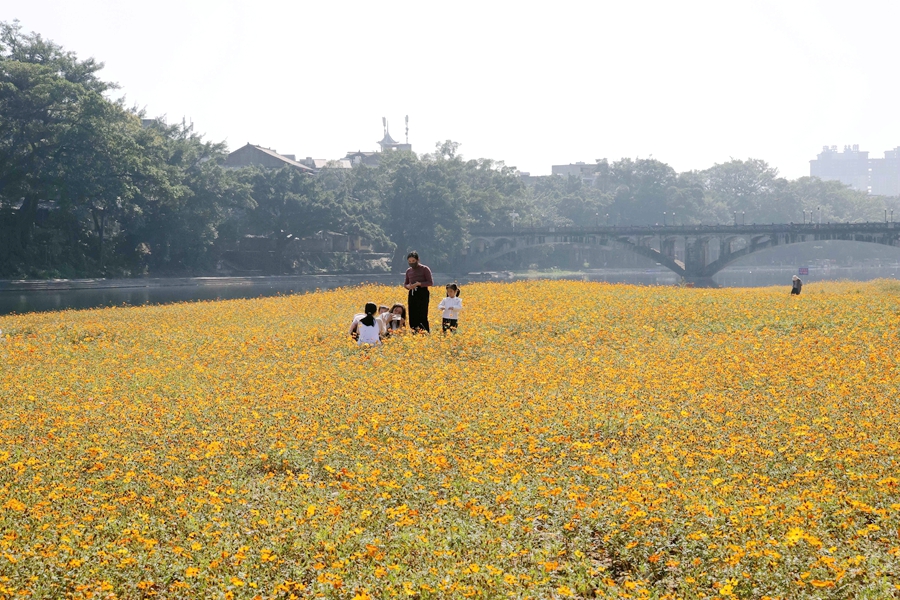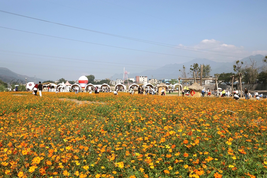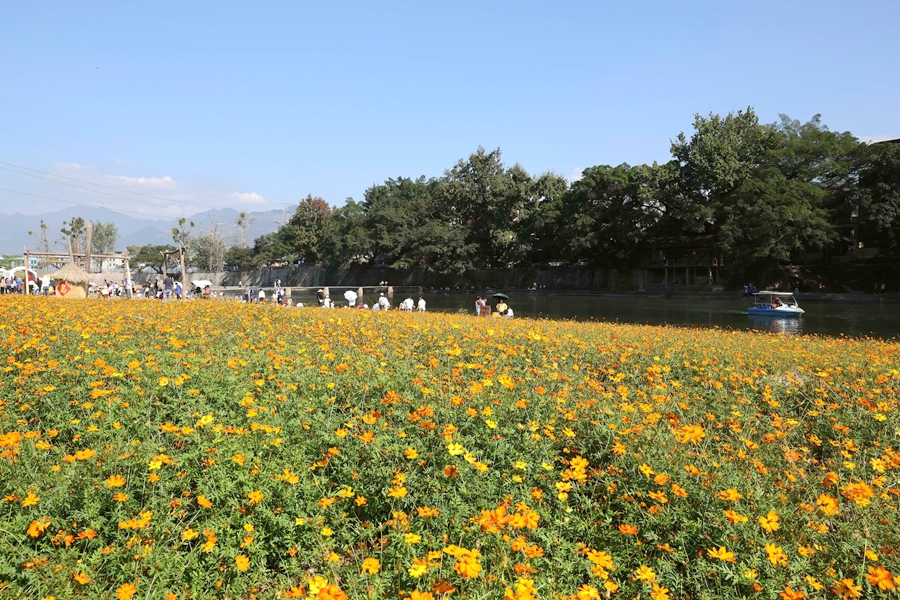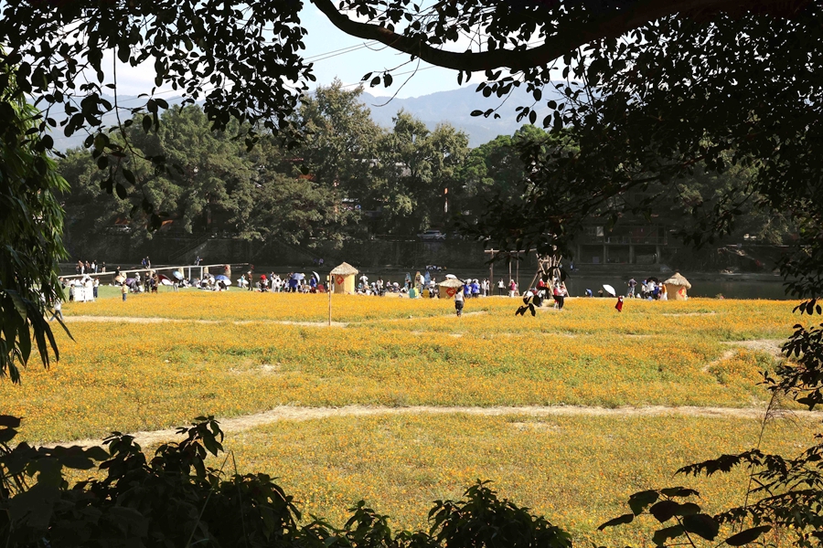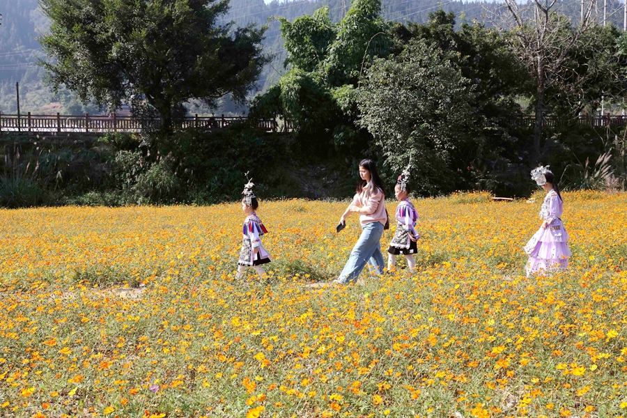 近日,贵州省黔东南苗族侗族自治州榕江县古州镇三宝侗寨开心岛的硫华菊竞相绽放,吸引众多游客前来观光游玩,拍照打卡,沉浸式感受鲜艳灿烂花海,硫华菊花海成为三宝侗寨一道亮丽的风景。