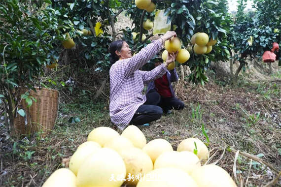 茅坪镇三红蜜柚种植基地里,圆滚滚的柚子挂满枝头,村民们采摘、分拣、打包的身影随处可见。