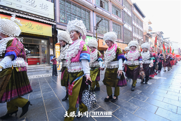上午10时,谷陇镇便沉浸在一片节日的喜悦中。“这套银饰陪我出嫁,今天要戴着它风风光光回娘家!”从凯里赶来的王英轻抚着熠熠生辉的银帽,眼中满是激动。文化广场上,盛装的姑妈们如绚丽的彩蝶般汇聚,老姐妹们相拥问候,欢声笑语不绝于耳。
