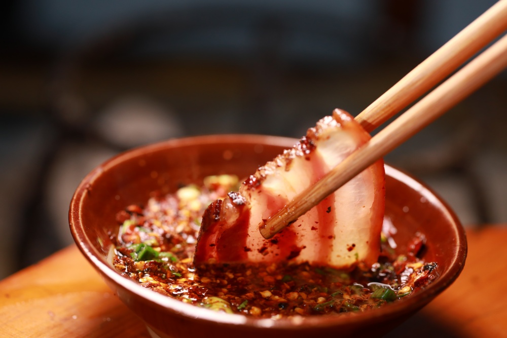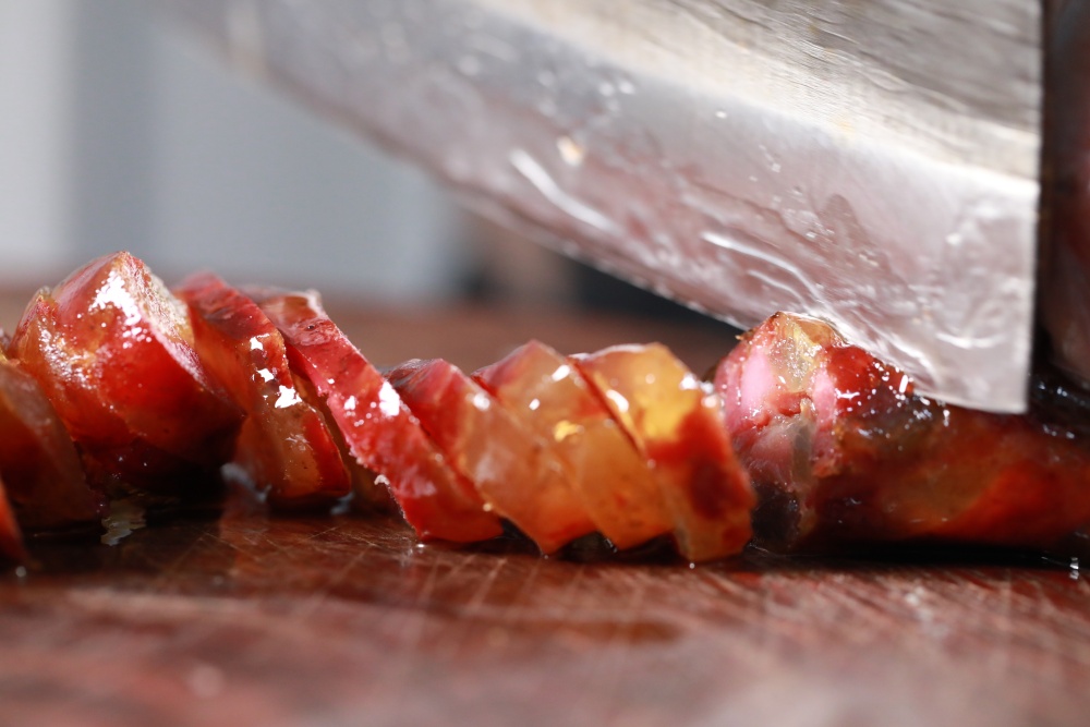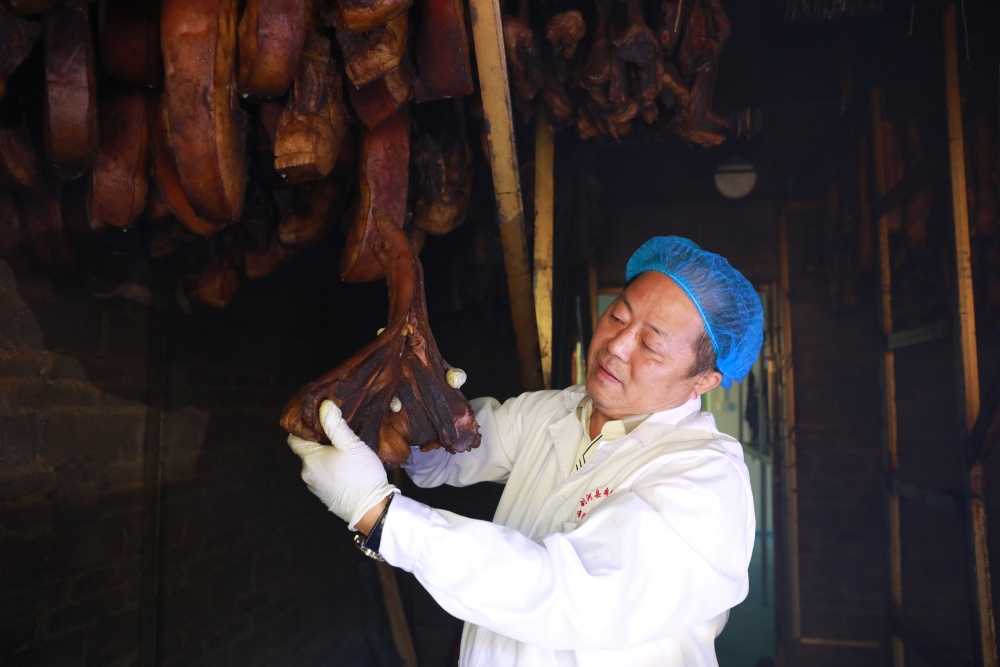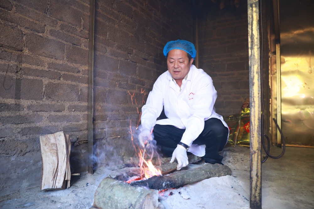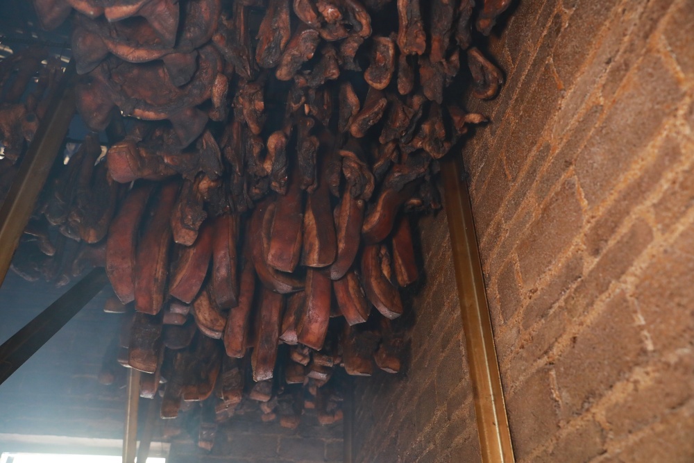 清晨,山沟中的农家烤房早已炊烟袅袅。虽然从小就耳闻目睹老一辈烤腊肉,但一上架就是几千斤,有着多年烘烤经验的老师傅欧阳克波也不敢掉以轻心。火候是腊肉的生命!添加柴火、腾挪烘烤位置、查看烘干情况,从早到晚守在烤房里的欧阳克波整日忙个不停。腊肉烘烤看似简单,实则窍门不少。“硬材穿透力强,烤出的腊肉颜色好看。关键是温度,进入烤房后要控制好,高了肉会柴、会烤熟;低了则容易变质。”欧阳克波说,烘烤腊肉的温度和时间都有严格要求,温度过高或时间过长,都会影响口感和品质。