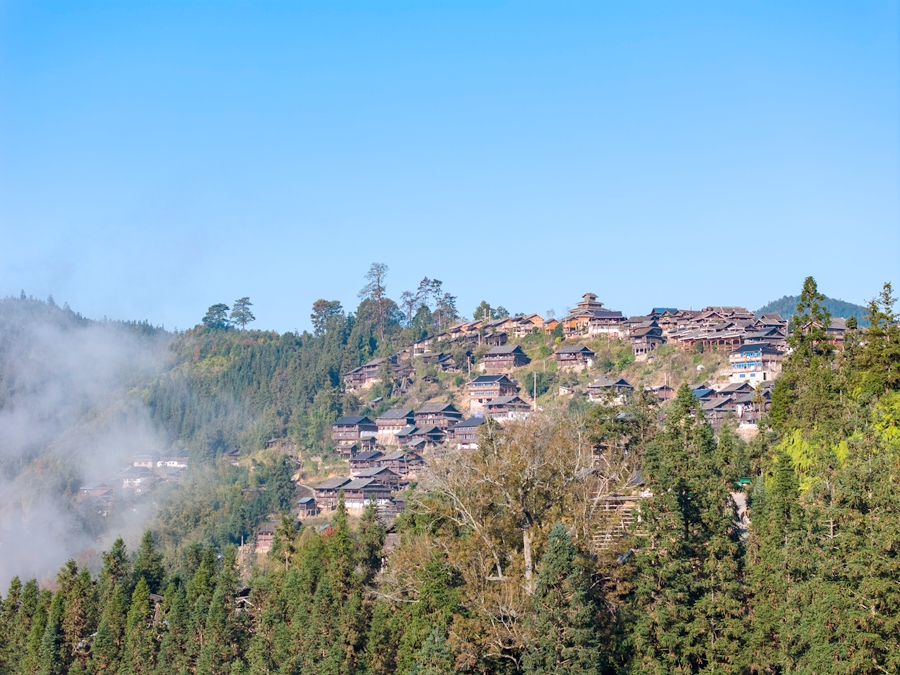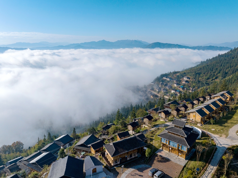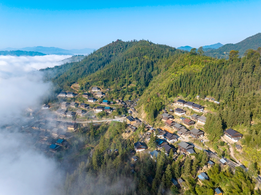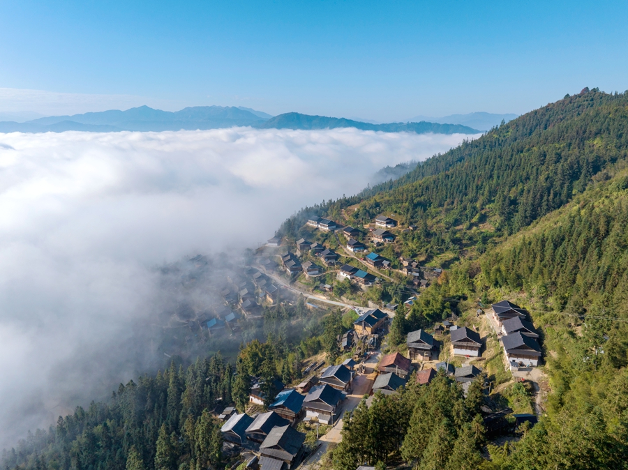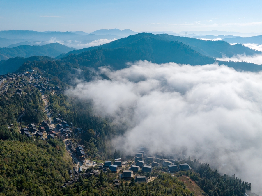冬日时节,贵州省黔东南苗族侗族自治州从江县丙妹镇大歹苗寨现云海景观,青山、民居、道路、田园等与云雾相互映衬,宛若仙境。
