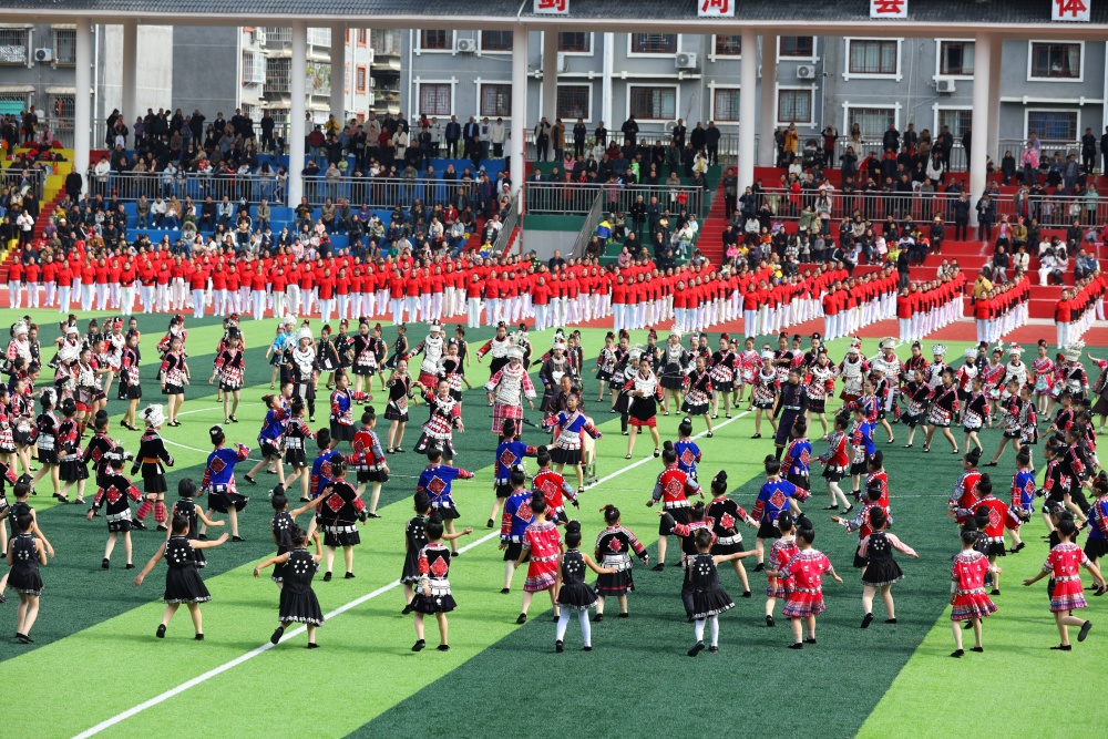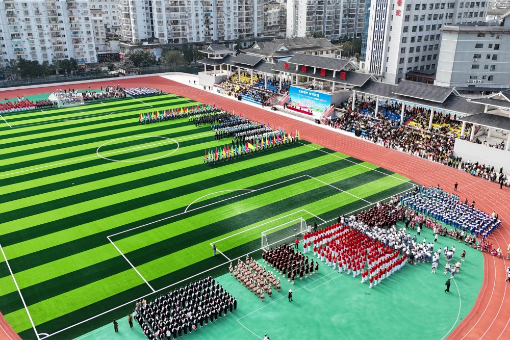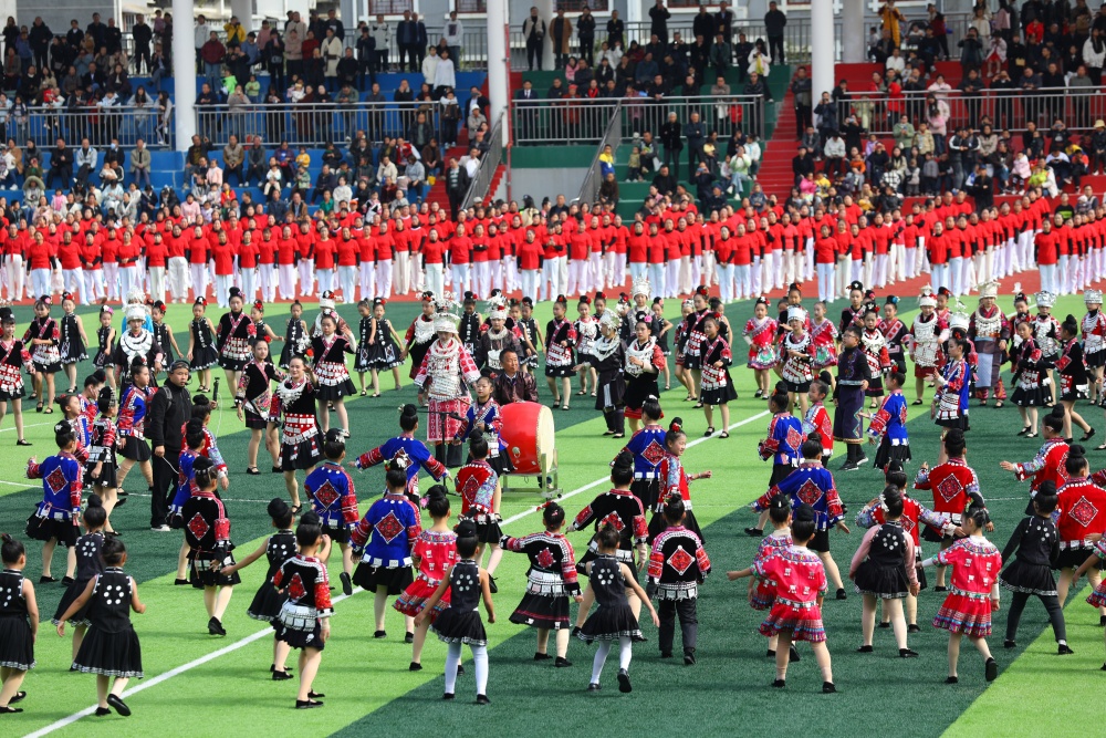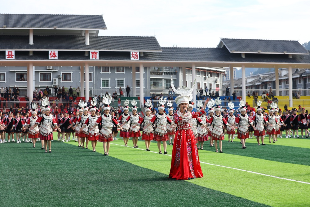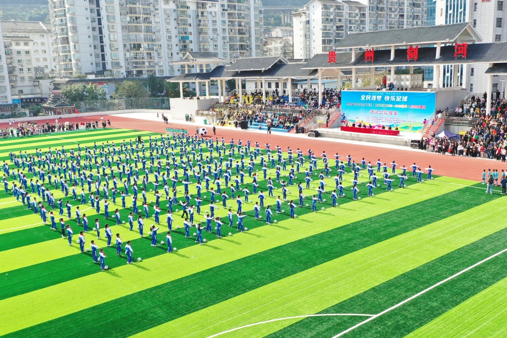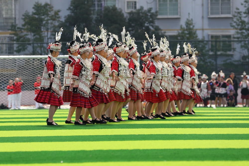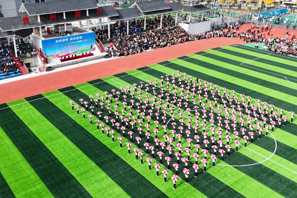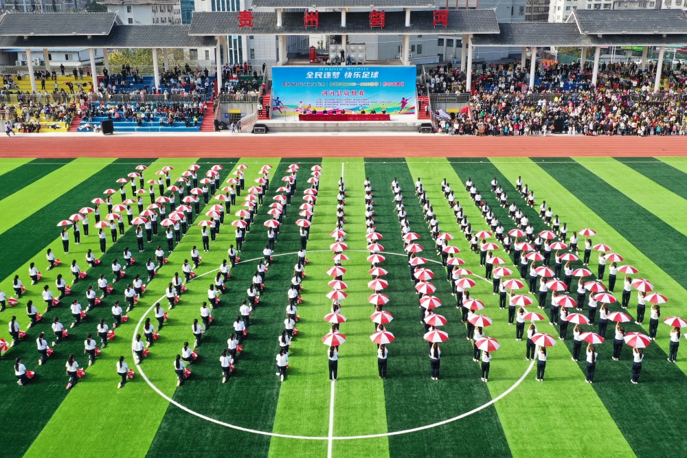 文艺表演环节精彩纷呈、亮点迭出。活力满满的足球操舞出运动激情,红色伞具阵型变换如星火流转、点亮赛场,极具黔东南民族特色的飞歌高亢嘹亮、水鼓舞气势磅礴,原生态文化与运动活力碰撞交融,赢得现场观众阵阵掌声。最后,全体演员共同演绎《同心同梦》,在球场中央汇聚成五个同心圆造型,寓意各族群众同心聚力、共逐梦想,为开幕式画上圆满句号。