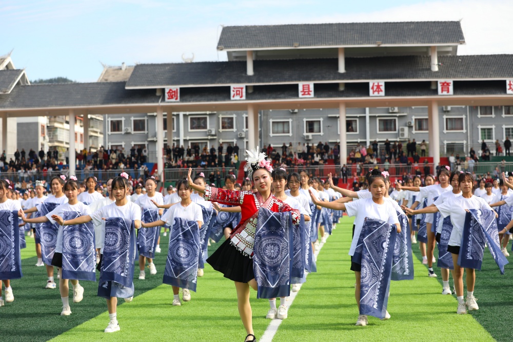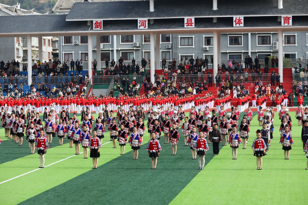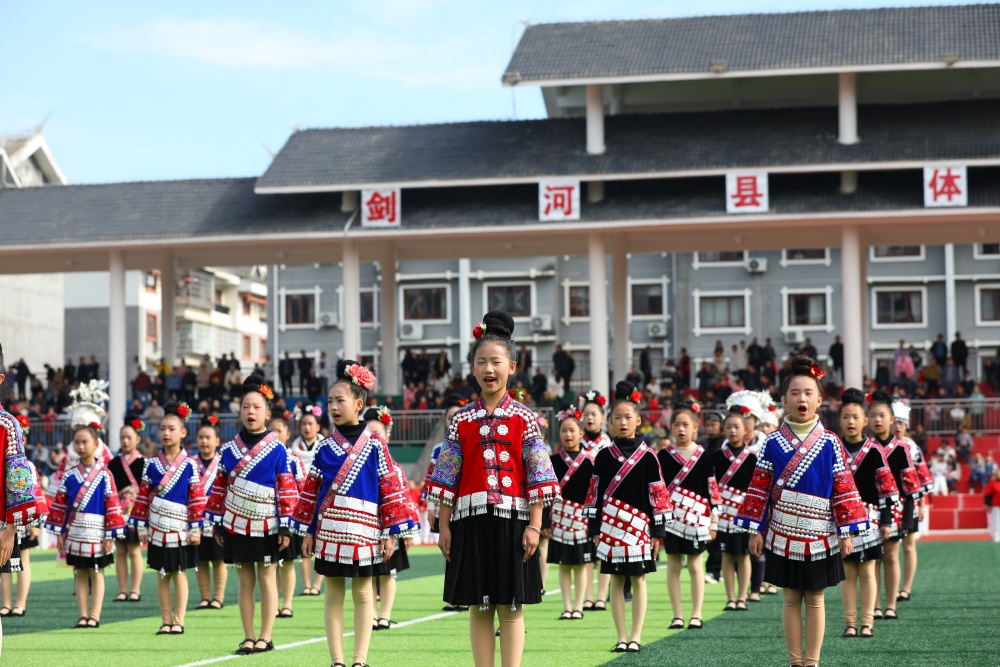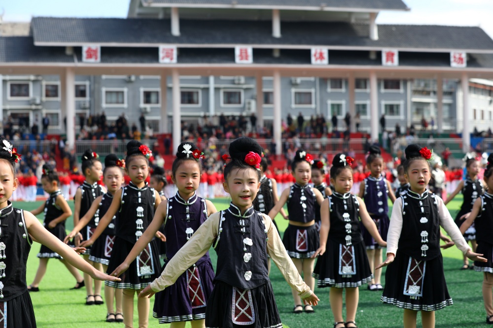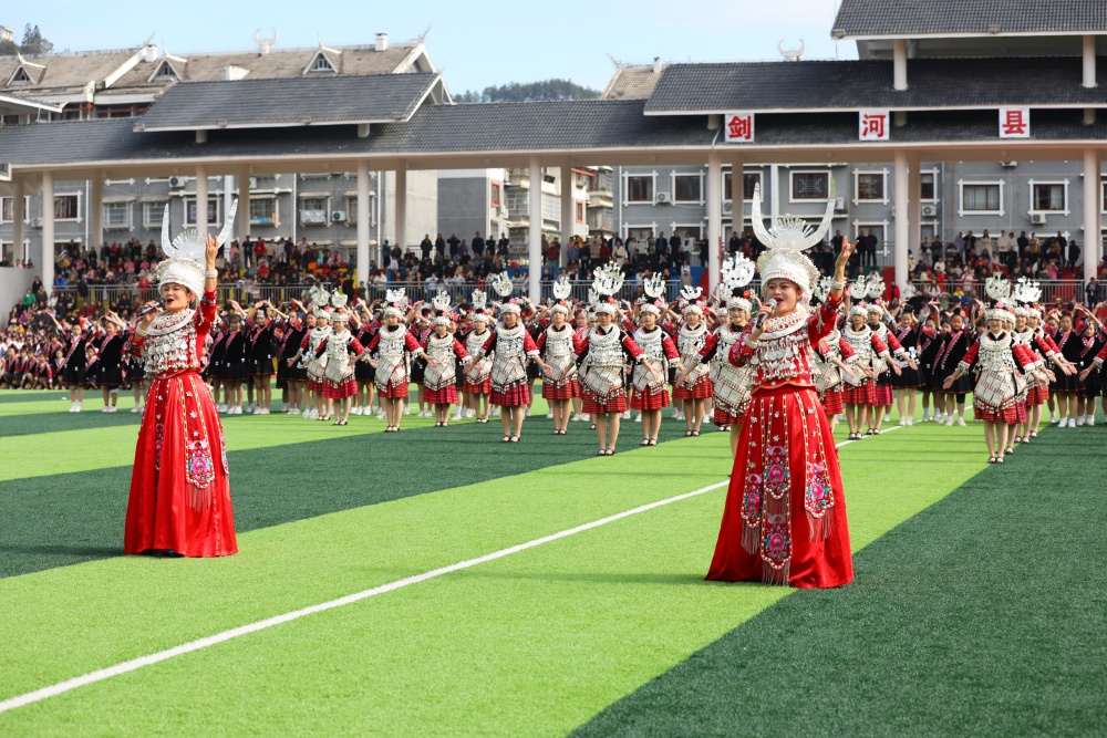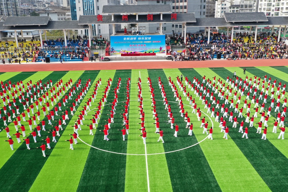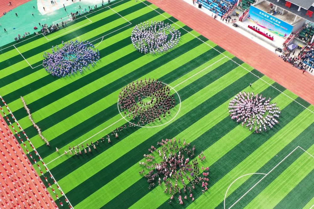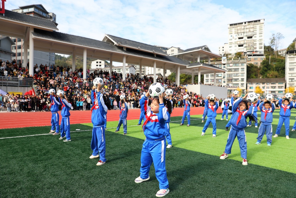 文艺表演环节精彩纷呈、亮点迭出。活力满满的足球操舞出运动激情,红色伞具阵型变换如星火流转、点亮赛场,极具黔东南民族特色的飞歌高亢嘹亮、水鼓舞气势磅礴,原生态文化与运动活力碰撞交融,赢得现场观众阵阵掌声。最后,全体演员共同演绎《同心同梦》,在球场中央汇聚成五个同心圆造型,寓意各族群众同心聚力、共逐梦想,为开幕式画上圆满句号。