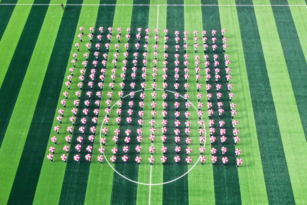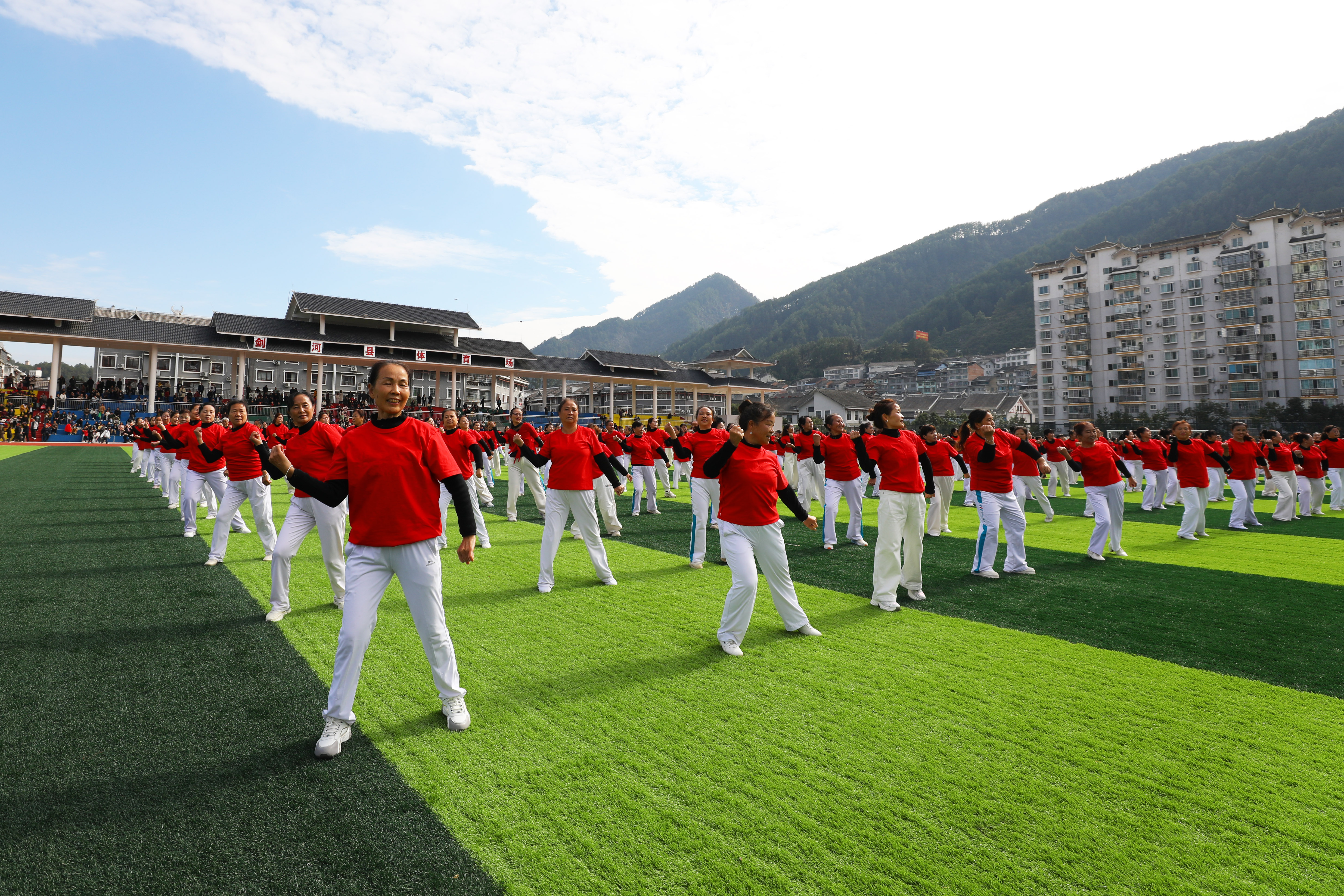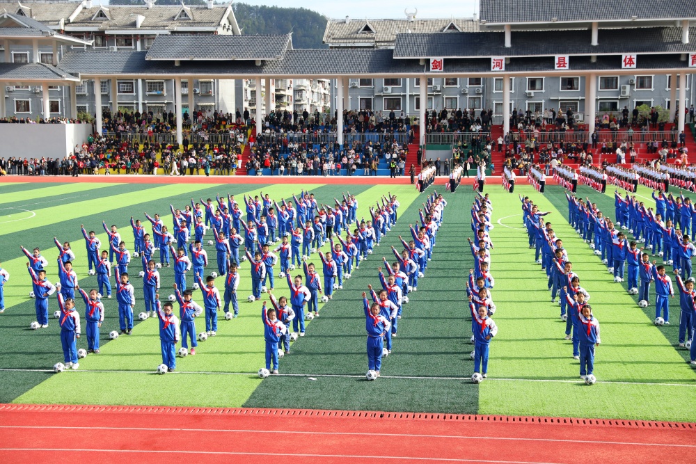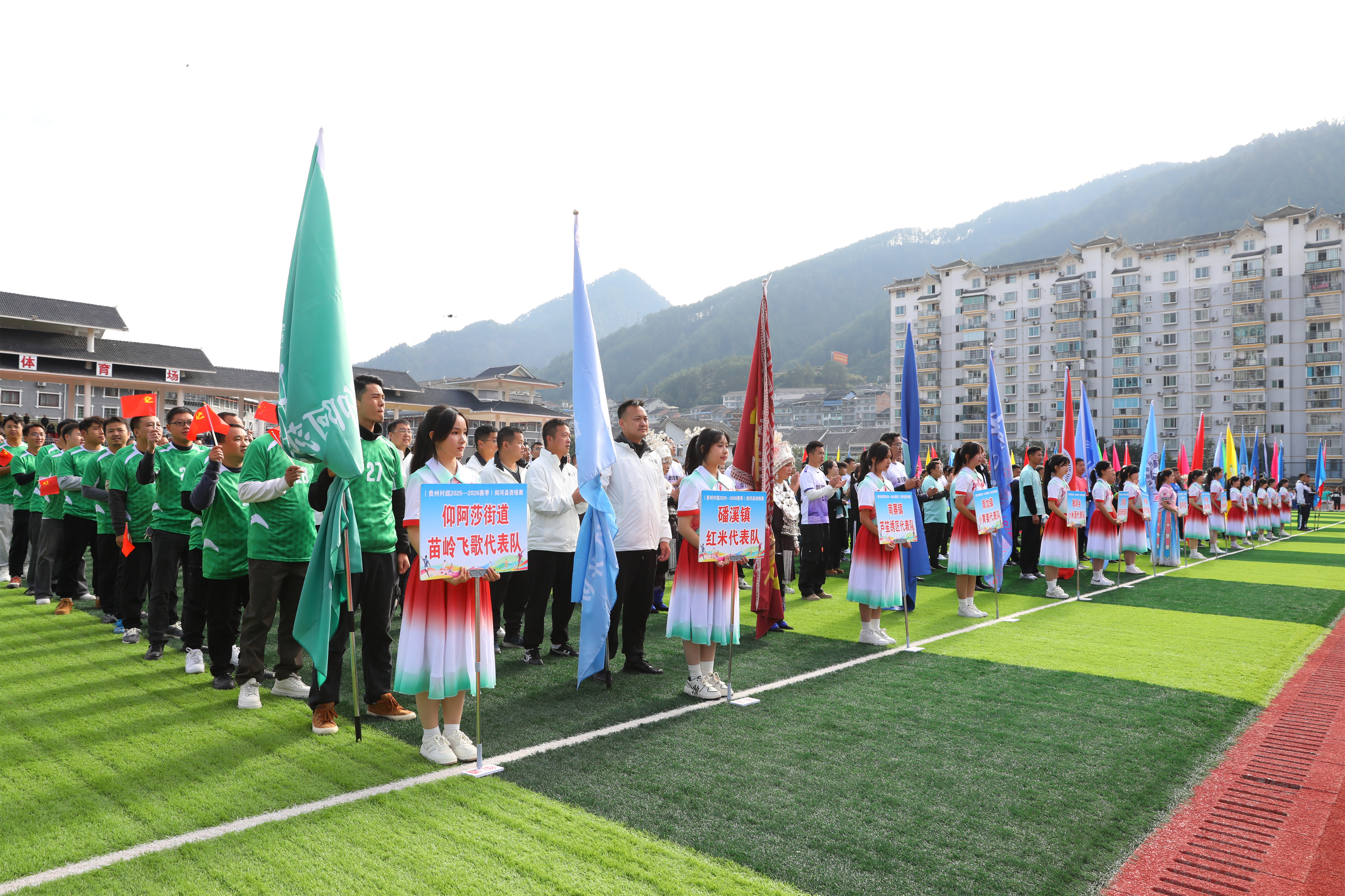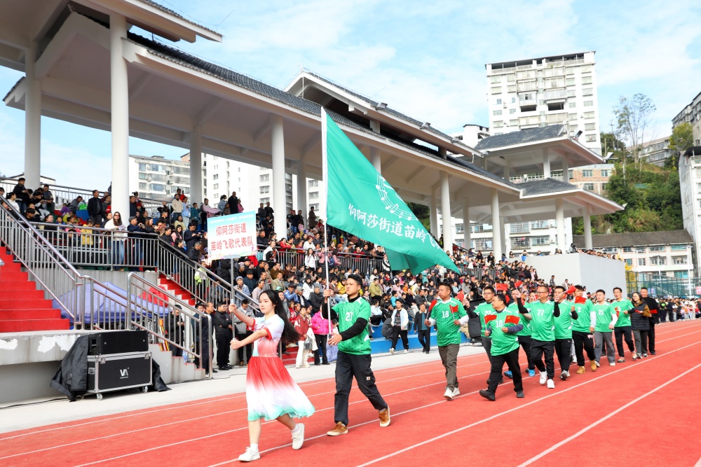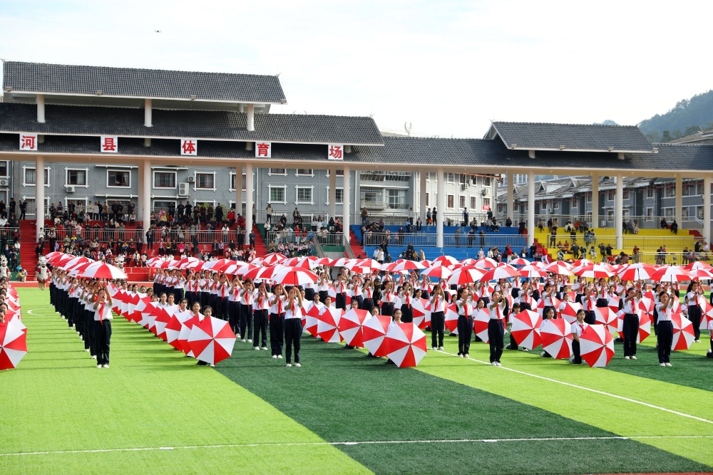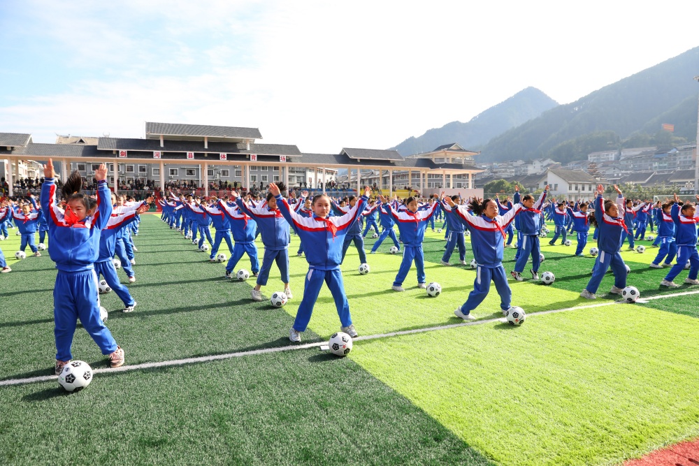 文艺表演环节精彩纷呈、亮点迭出。活力满满的足球操舞出运动激情,红色伞具阵型变换如星火流转、点亮赛场,极具黔东南民族特色的飞歌高亢嘹亮、水鼓舞气势磅礴,原生态文化与运动活力碰撞交融,赢得现场观众阵阵掌声。最后,全体演员共同演绎《同心同梦》,在球场中央汇聚成五个同心圆造型,寓意各族群众同心聚力、共逐梦想,为开幕式画上圆满句号。