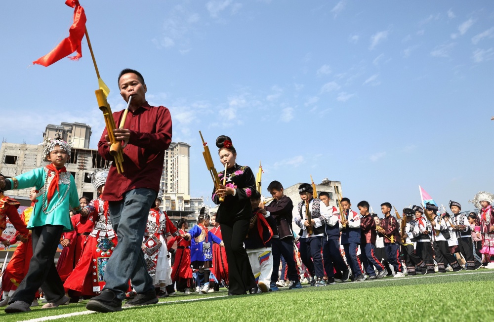 11月24日,在贵州省黔东南苗族侗族自治州榕江县古州镇第六小学,学生在跳芦笙舞。