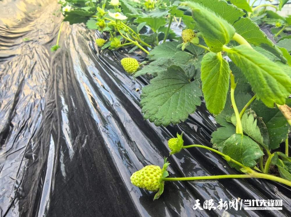 在基地的另一端,20多个草莓大棚同样生机盎然。掀开保温膜,淡淡的果香扑面而来,翠绿藤蔓间,白色小花星星点点,绿色的幼果已挂上枝头,长势喜人。