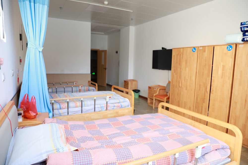 走进中心,处处可见适老化改造的贴心细节:防滑地砖铺满走廊,扶手在墙角、床头随处可见,房间内家具边角做了圆角处理,紧急呼叫按钮触手可及,每一处设计都彰显着对老人的关怀。