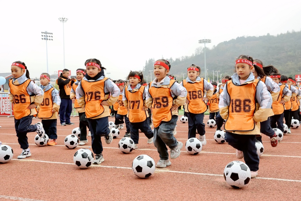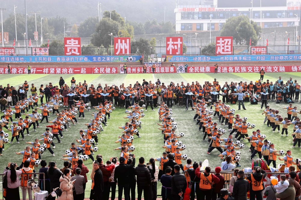 11月27日,在贵州省黔东南苗族侗族自治州榕江县城北新区“村超”球场,古州镇中心幼儿园小朋友在表演足球操。