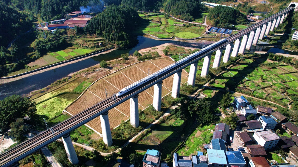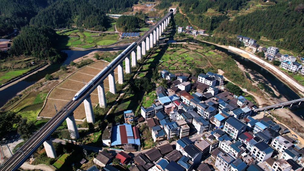 11月29日,列车在贵州省黔东南苗族侗族自治州从江县谷坪乡帮土侗寨高架桥上穿越,与青山、侗寨、河水相映成趣,构成一幅美丽的冬日画卷。