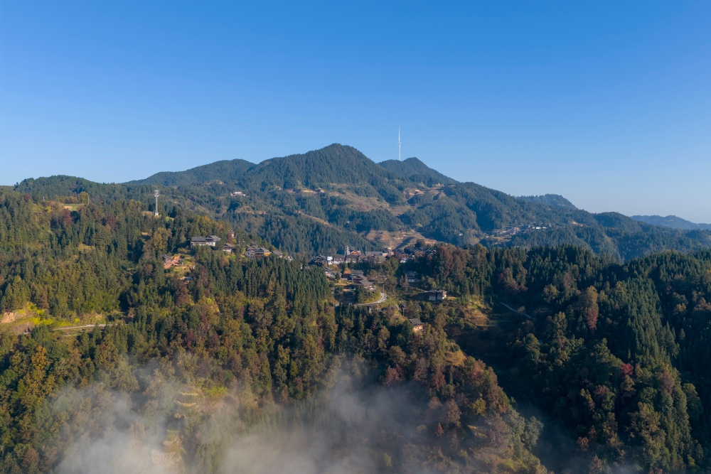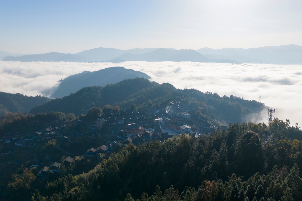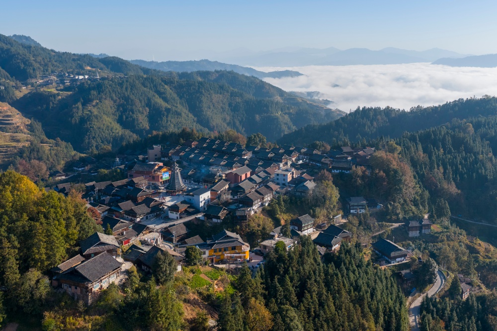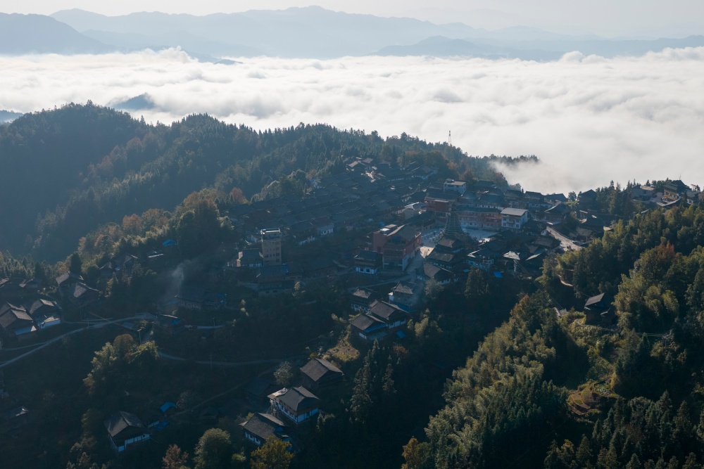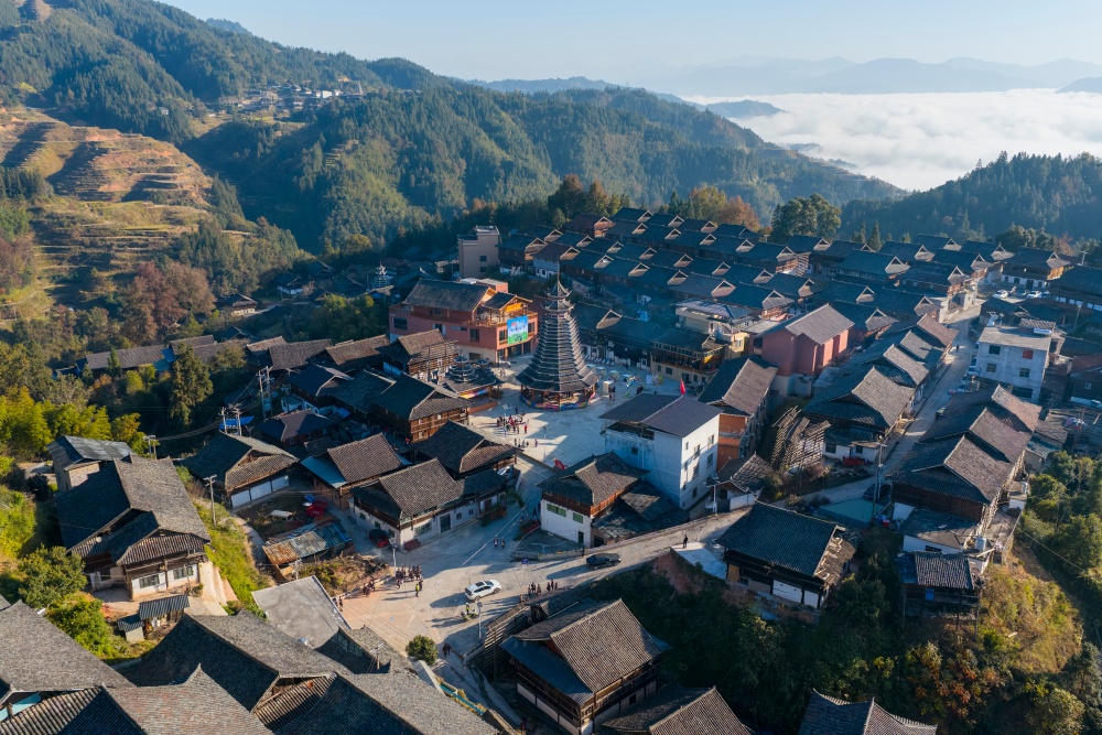初冬时节,贵州省黔东南苗族侗族自治州从江县高增乡新生侗寨云雾妖娆,美不胜收。侗寨鼓楼、吊脚楼与乡村田野和云海相互映衬,共同绘就一幅美丽的乡村生态画卷。
