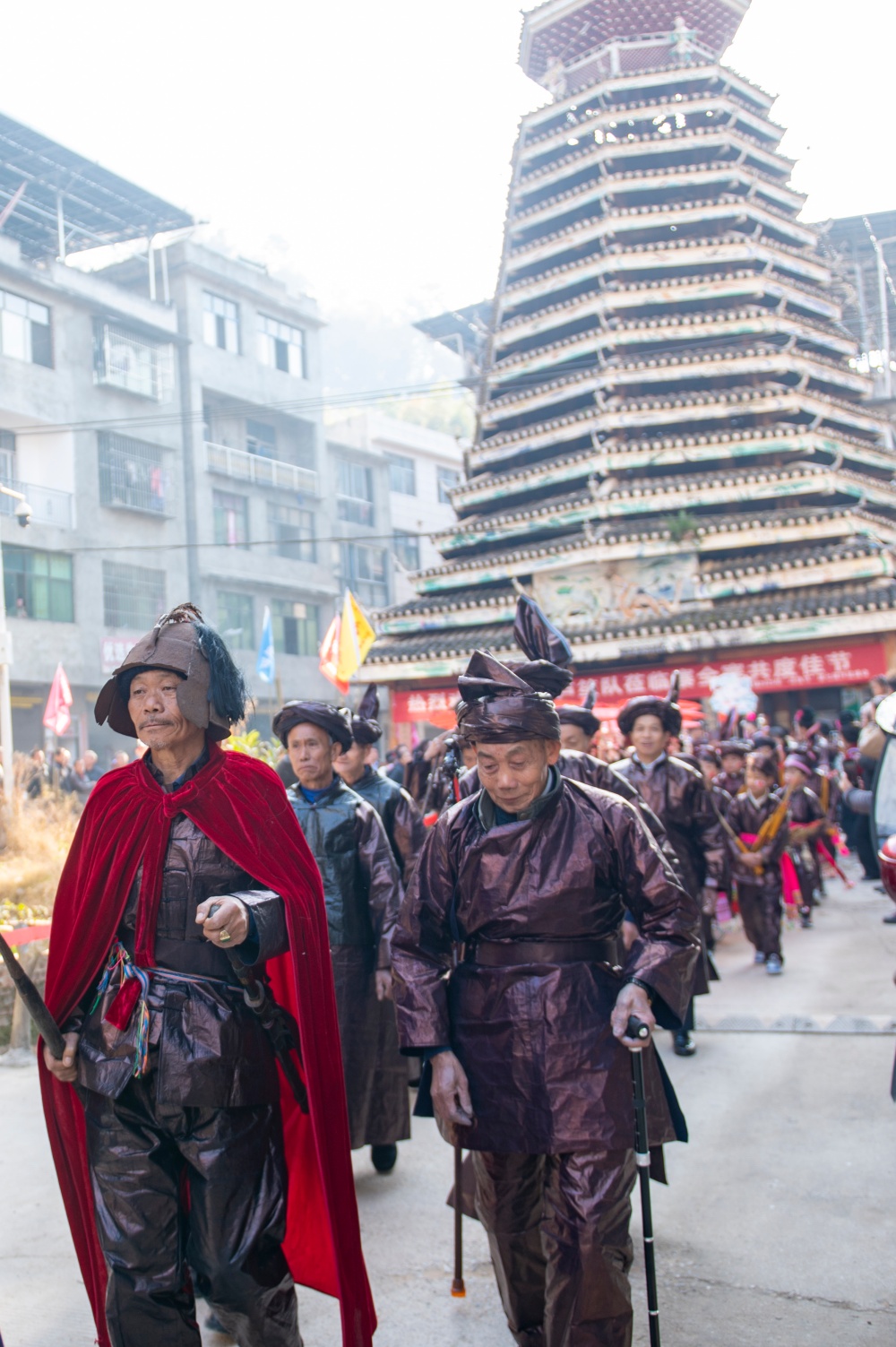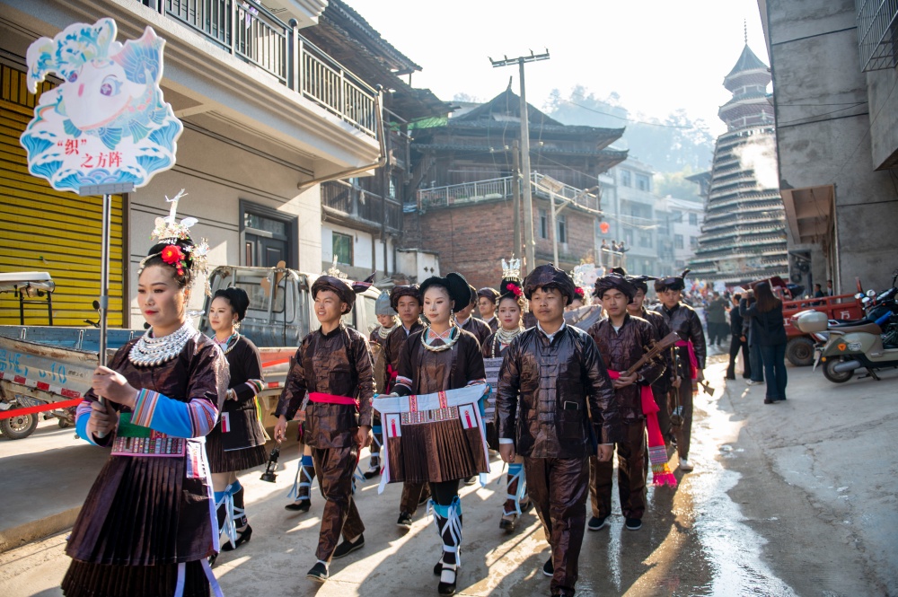 12月1日,在贵州省从江县庆云镇“冻鱼节”上,侗族群众参加非遗巡游活动。