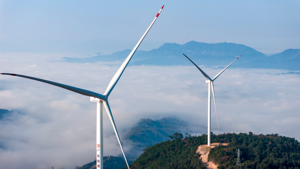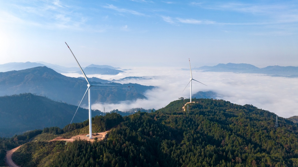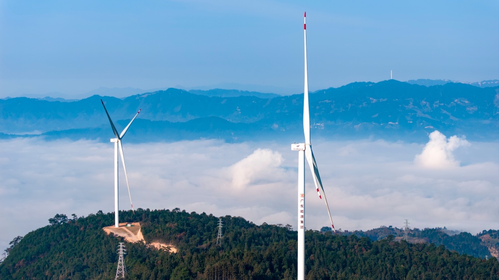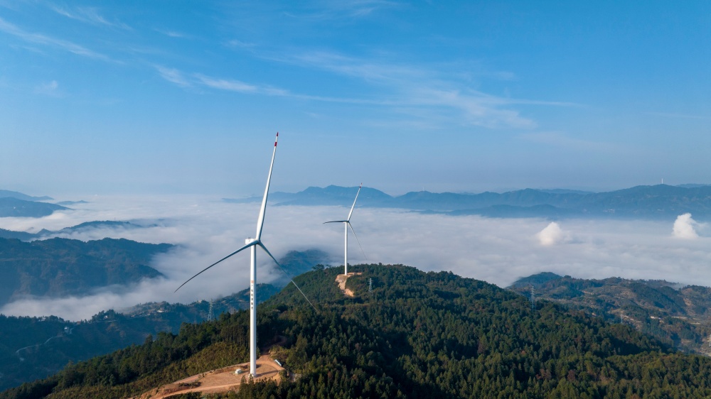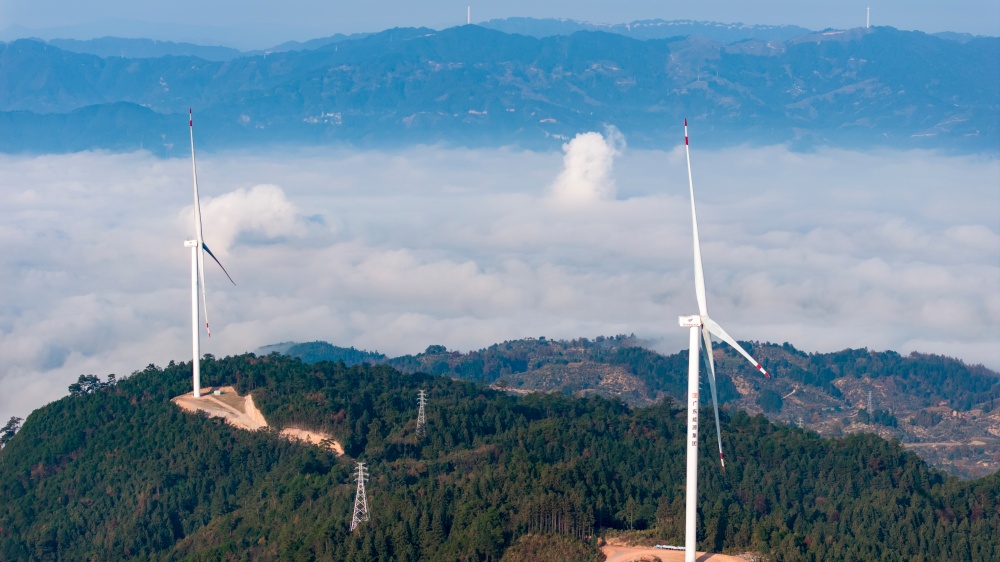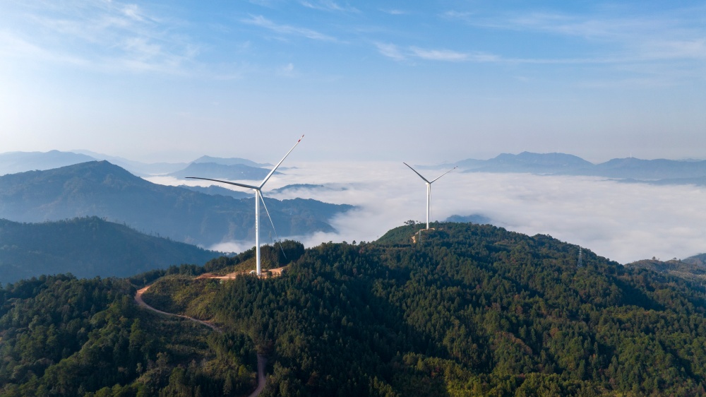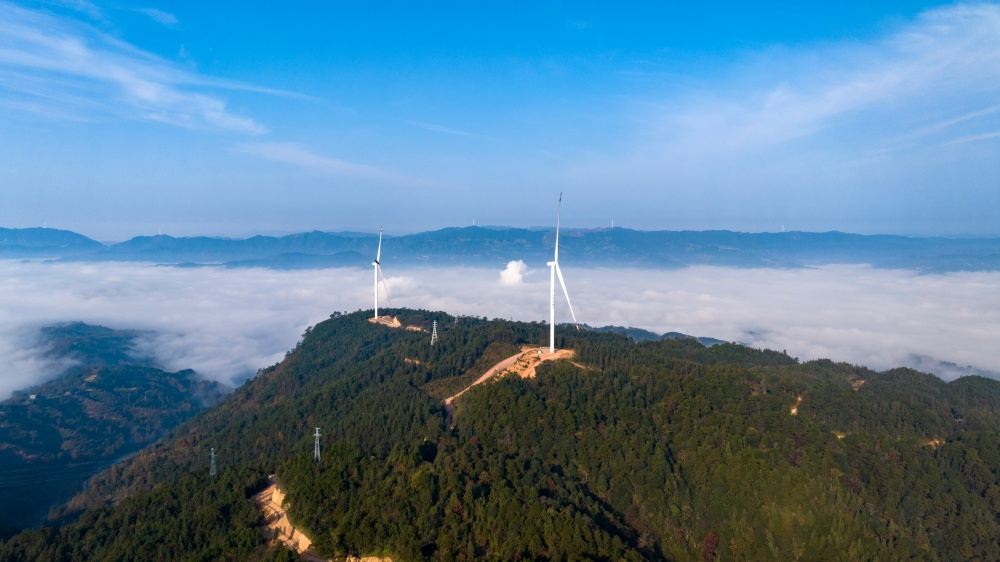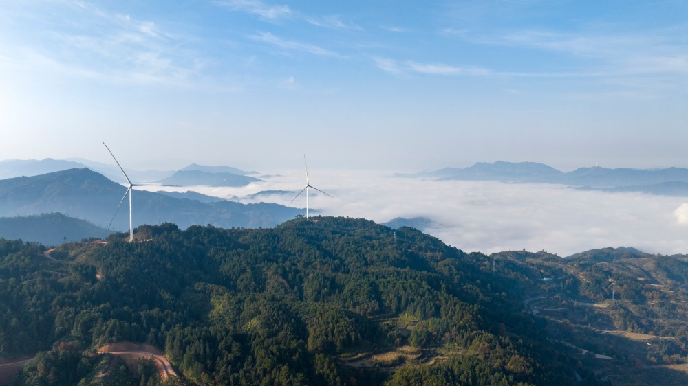 当日,贵州省黔东南苗族侗族自治州从江县归树山风电场,耸立在山巅之上的一台台风力发电机组与连绵青山相映成景,构成了一幅美丽的生态画卷。