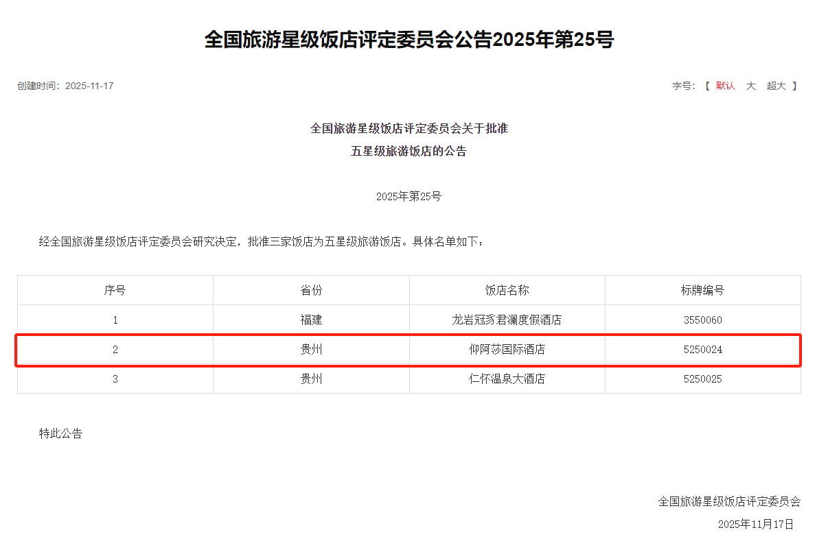 经州、省逐级评定推荐,2025年10月,国评专家对酒店进行了暗访、网评分析及现场体验。仰阿莎国际酒店凭借出色的表现,最终以441分成功摘星,获评五星级旅游饭店。