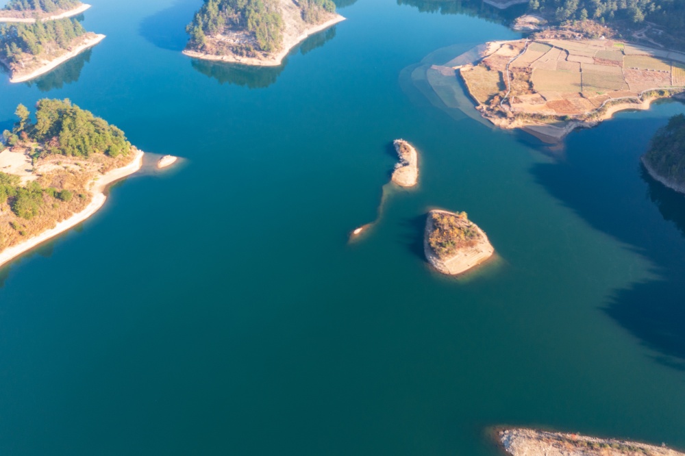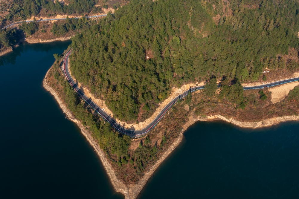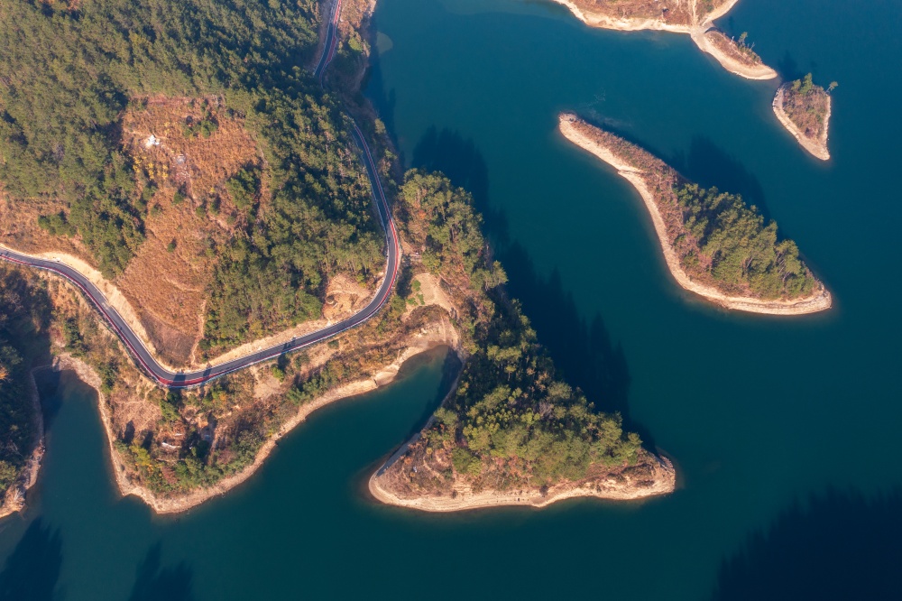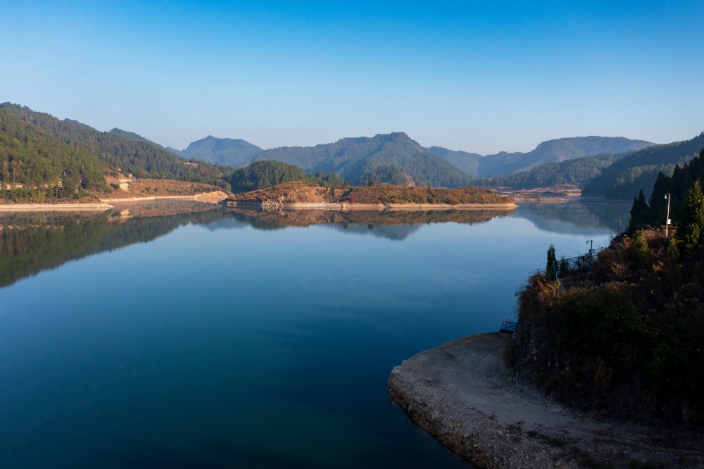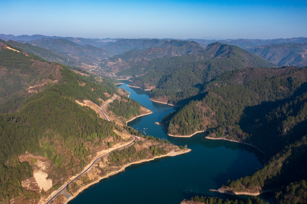 冬日时节,贵州省黔东南苗族侗族自治州岑巩县大有镇下溪水库,碧绿的湖水镶嵌在色彩斑斓的群山之间,与夕阳的余辉、错落有致的村庄、蜿蜒道路等相映成景,构成一幅壮美的生态画卷。