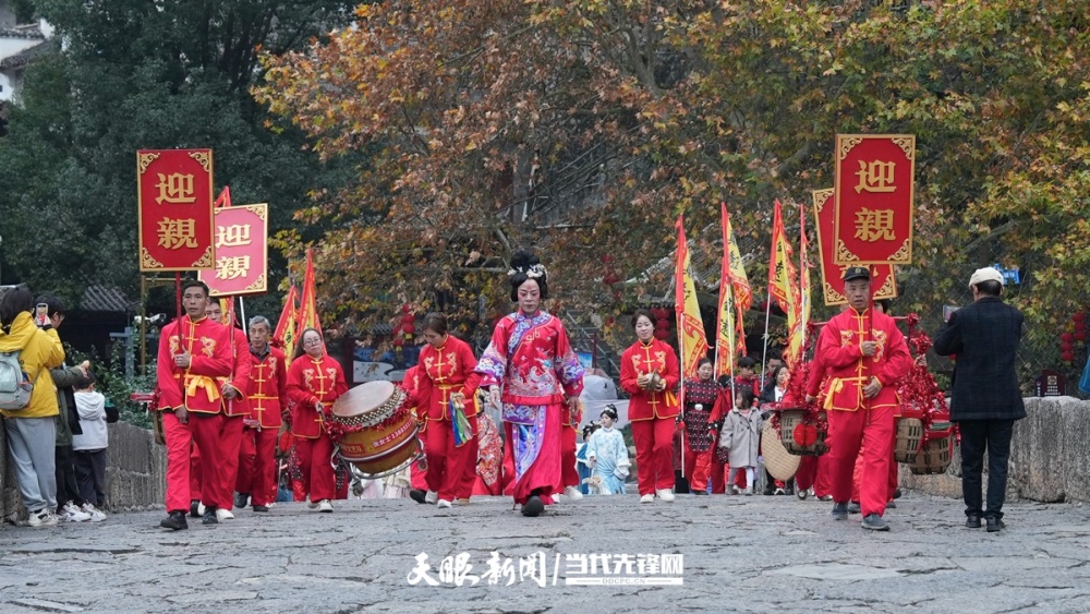 巡游队伍以身穿特色服饰的“龙婆婆”为核心,她引领身着婚服的“新婚夫妇”走在队伍最前列,沿古城主要街巷缓缓行进。队伍阵容雅致丰富,既有仪仗执事的迎亲人员,也有身着古装、衣袂翩跹的表演者,步履流转间古韵尽显,宛如一幅流动的风景画。