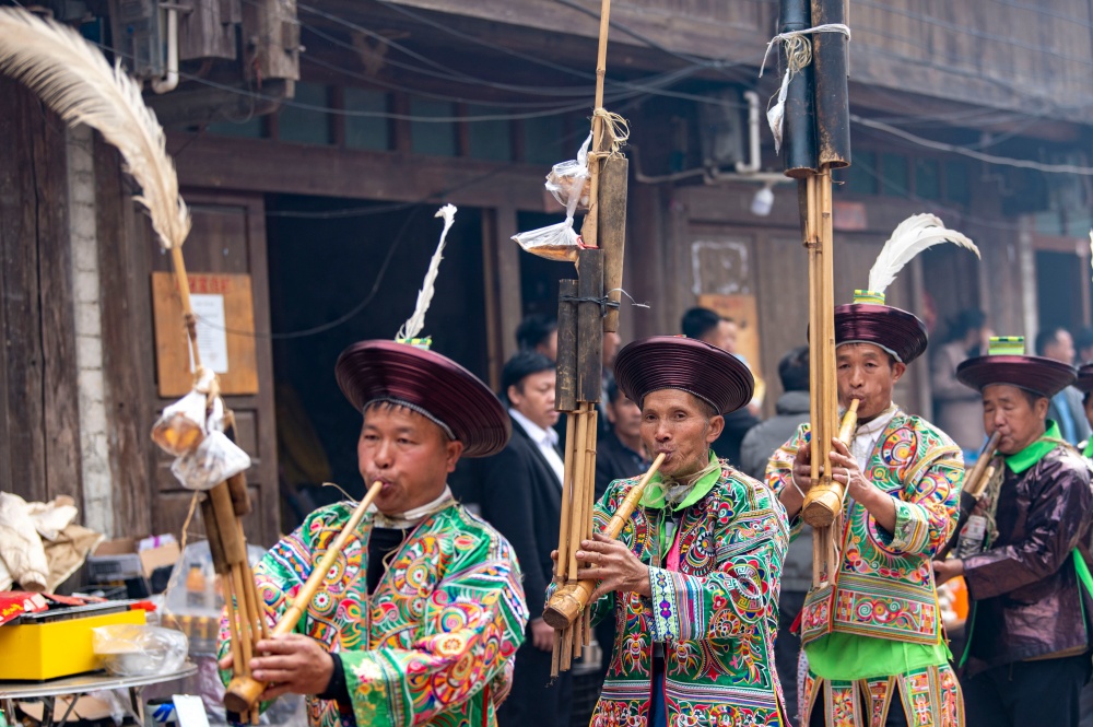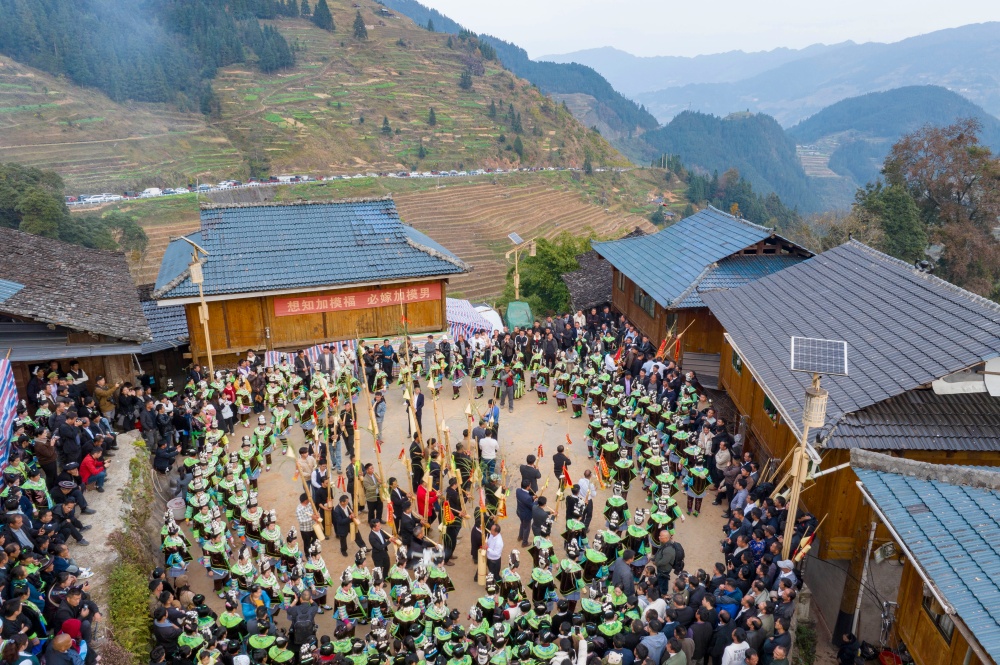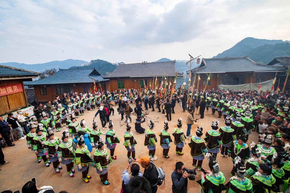 12月10日,盛装打扮的苗族村民在贵州省从江县加勉乡加模村鼓藏节上跳芦笙舞。