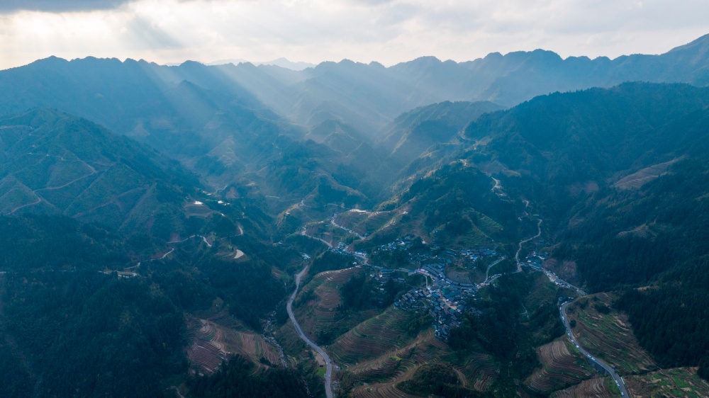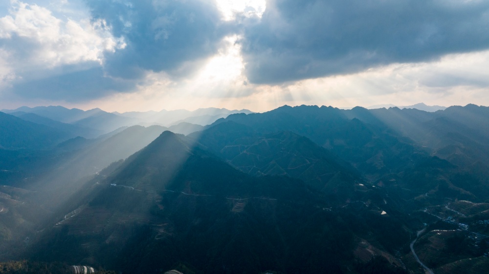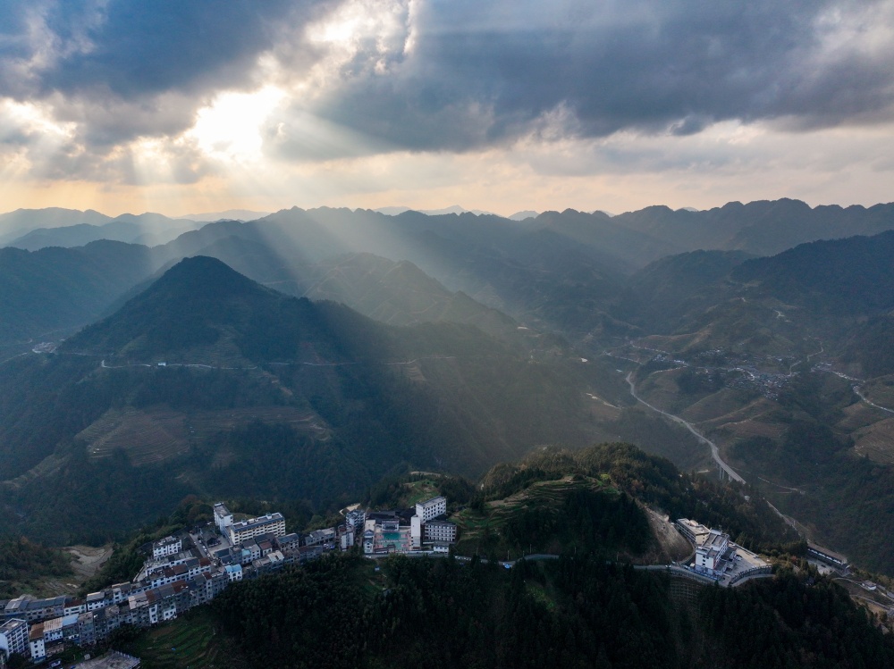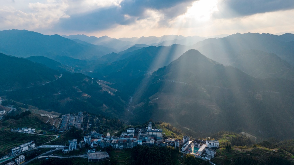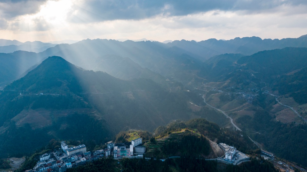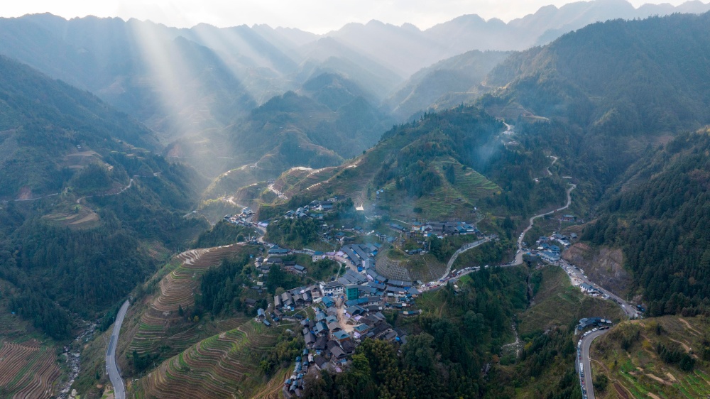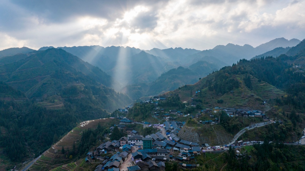 当日,位于贵州省黔东南苗族侗族自治州月亮山腹地的从江县加勉乡的上空出现“丁达尔”现象,阳光穿透云层,形成一道道金色光束,与连绵山峦、城镇、村落、梯田、公路相映成景,宛如秘境。