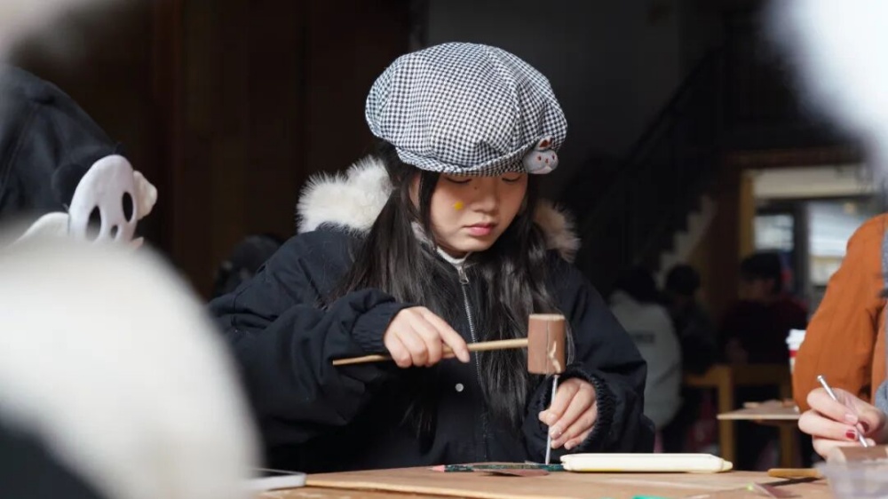 在另一边的银饰锻造工坊中,当地银匠一边讲述苗族故事,一边向游客介绍银饰技艺。随后,大家选取自己心仪的纹样图稿,在叮咚起伏的敲打声中,亲手将银片慢慢锻造成型,沉浸于非遗技艺的独特魅力中。