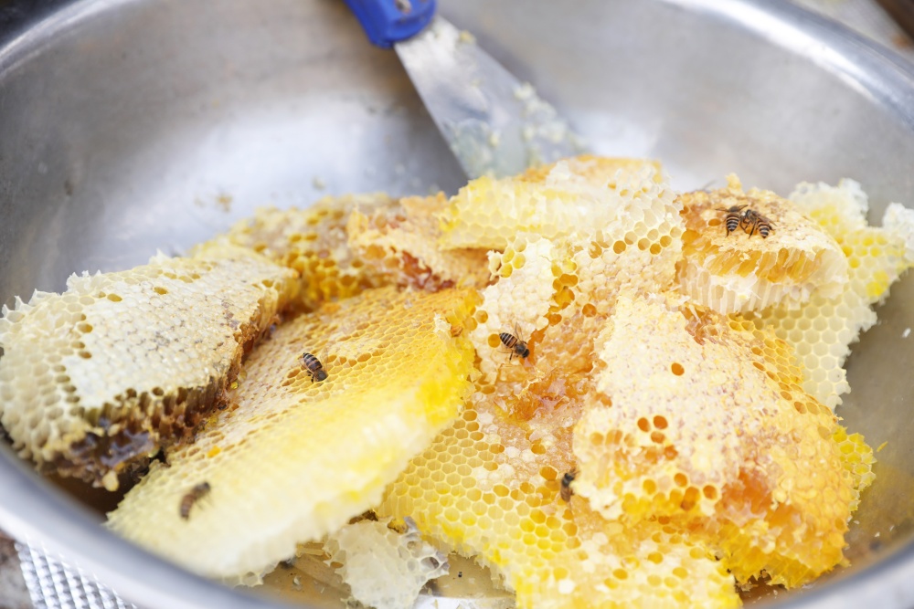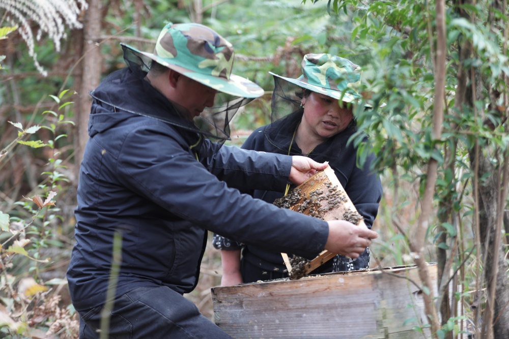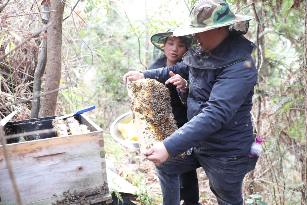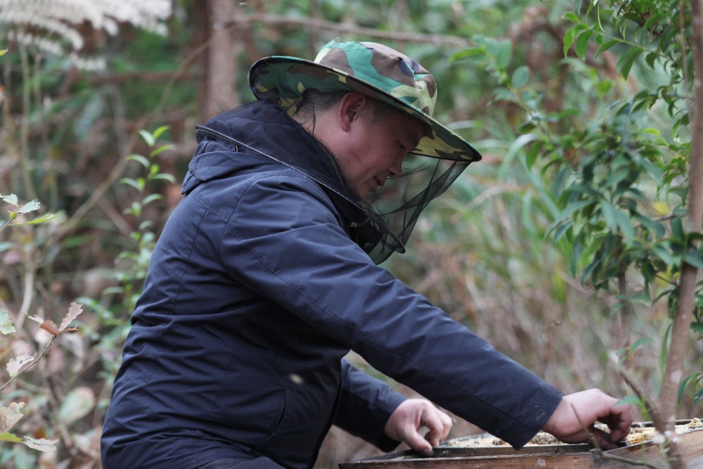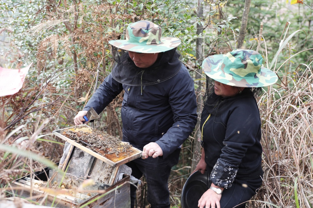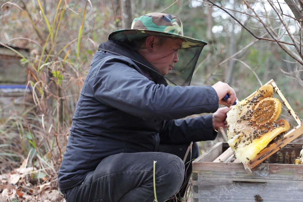 冬日的暖阳漫洒在山野,林子里多了几分暖意。基地负责人万木豆与妻子穿行其间,仔细查看蜂箱状况,清理周围叶子与杂草,为蜂群的生活打造一片干净舒适的环境。夫妻俩熟练地进行割蜜、摇蜜等工序,为顾客尽早享受到这份“甜蜜”而奔忙。“冬天气温较低,蜂群会把蜂箱内的温度控制在25度左右,我们也要在蜂箱上多盖两层保暖。”万木豆说。