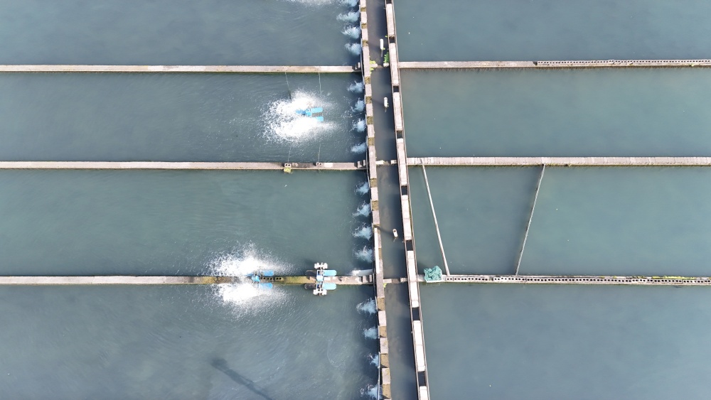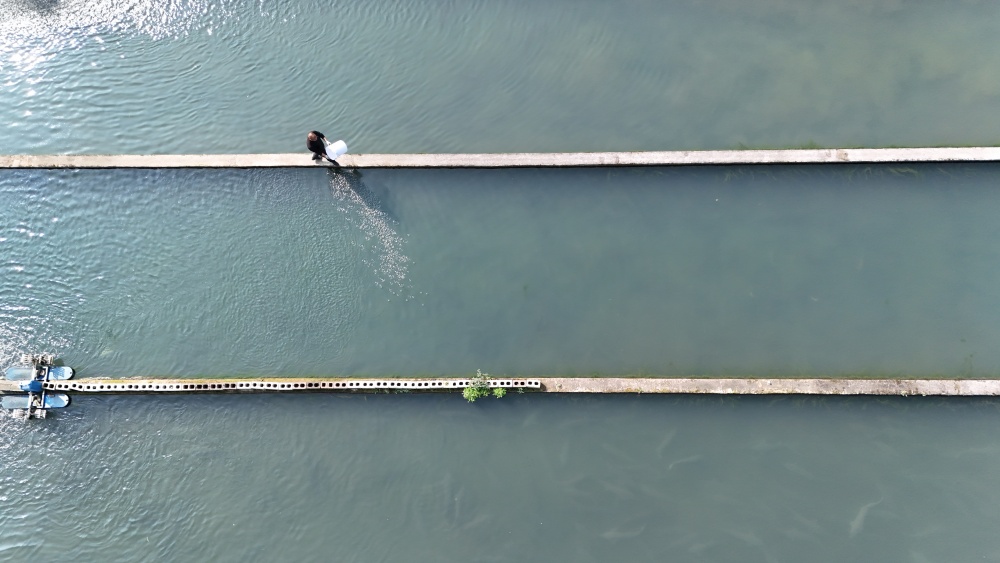 基地管理员王传生手提饲料桶,在规整的鱼池间穿梭忙碌,手臂轻挥间,生态饲料均匀撒入水中,黝黑的鲟鱼脊背在水花中穿梭跃动。