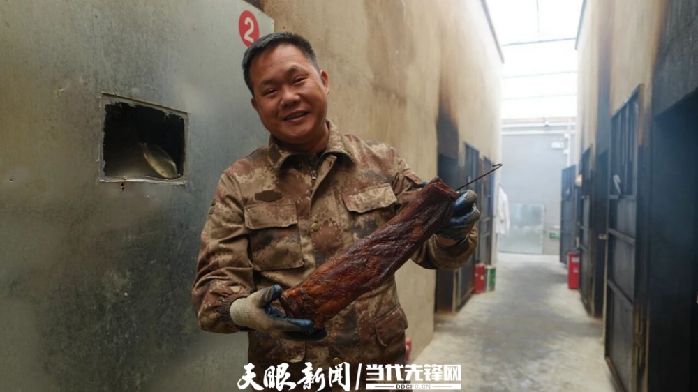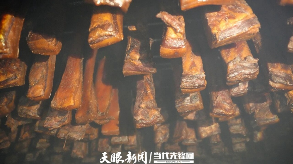 14间标准化烤房火力全开,一缕缕青烟裹挟着青冈木的香气缓缓飘散,熏制架上一排排色泽金红、油脂晶莹的腊肉正静静等待着时间的馈赠。烤房内,公司负责人杨天才在仔细翻动着肉块,控制着火候,确保每一块腊肉都能均匀受热,熏出最地道的风味。